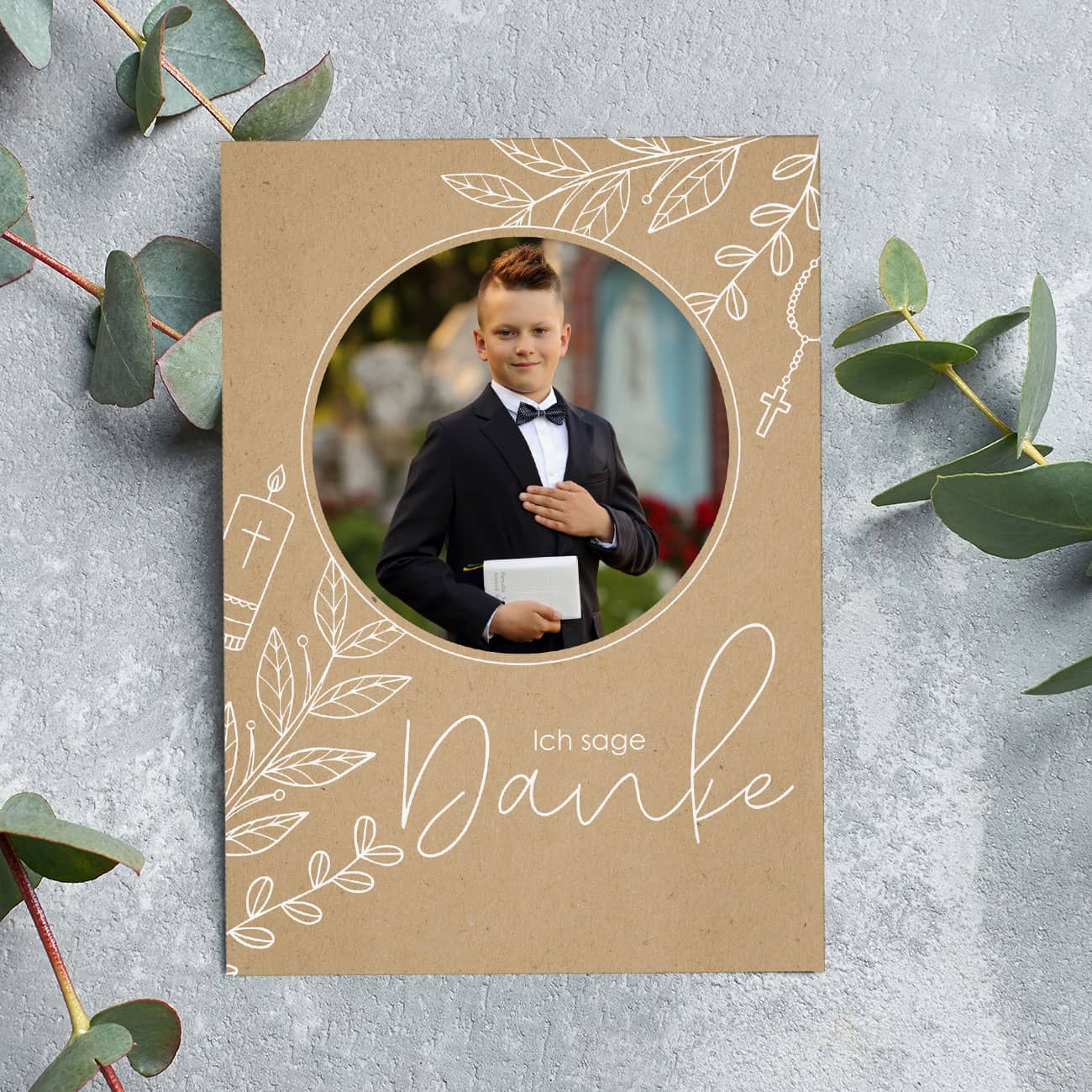 Ich sage Danke - Danksagungskarte mit Foto und kirchlichen Symbolen