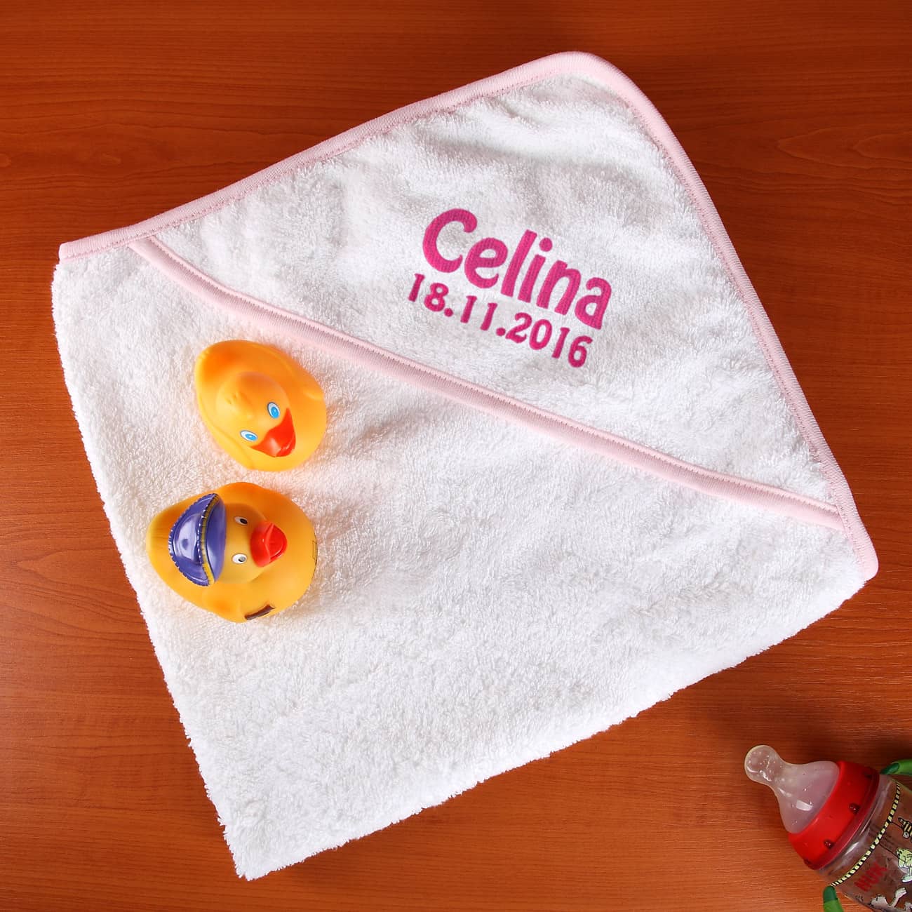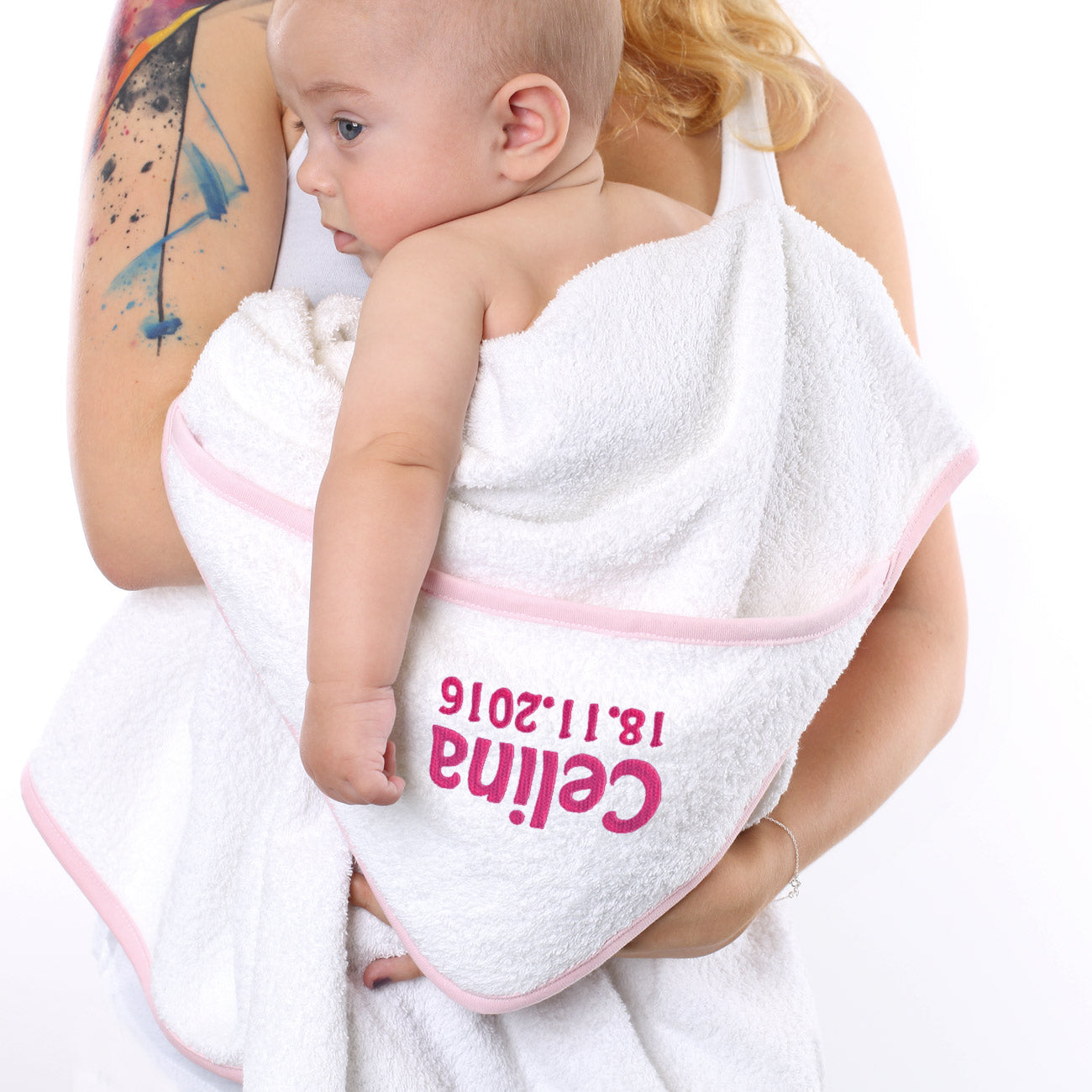 Dieses Kapuzenhandtuch aus Frottee wird mit ihrem Wunschnamen und Datum bestickt. Das große Baby-Handtuch hat am linken oberen Ende eine Kapuze, auf der in der Farbe Rosa Name und Datum platziert werde. Das Handtuch ist ein schönes und praktisches Geschenk zur Geburt eines Mädchens.
