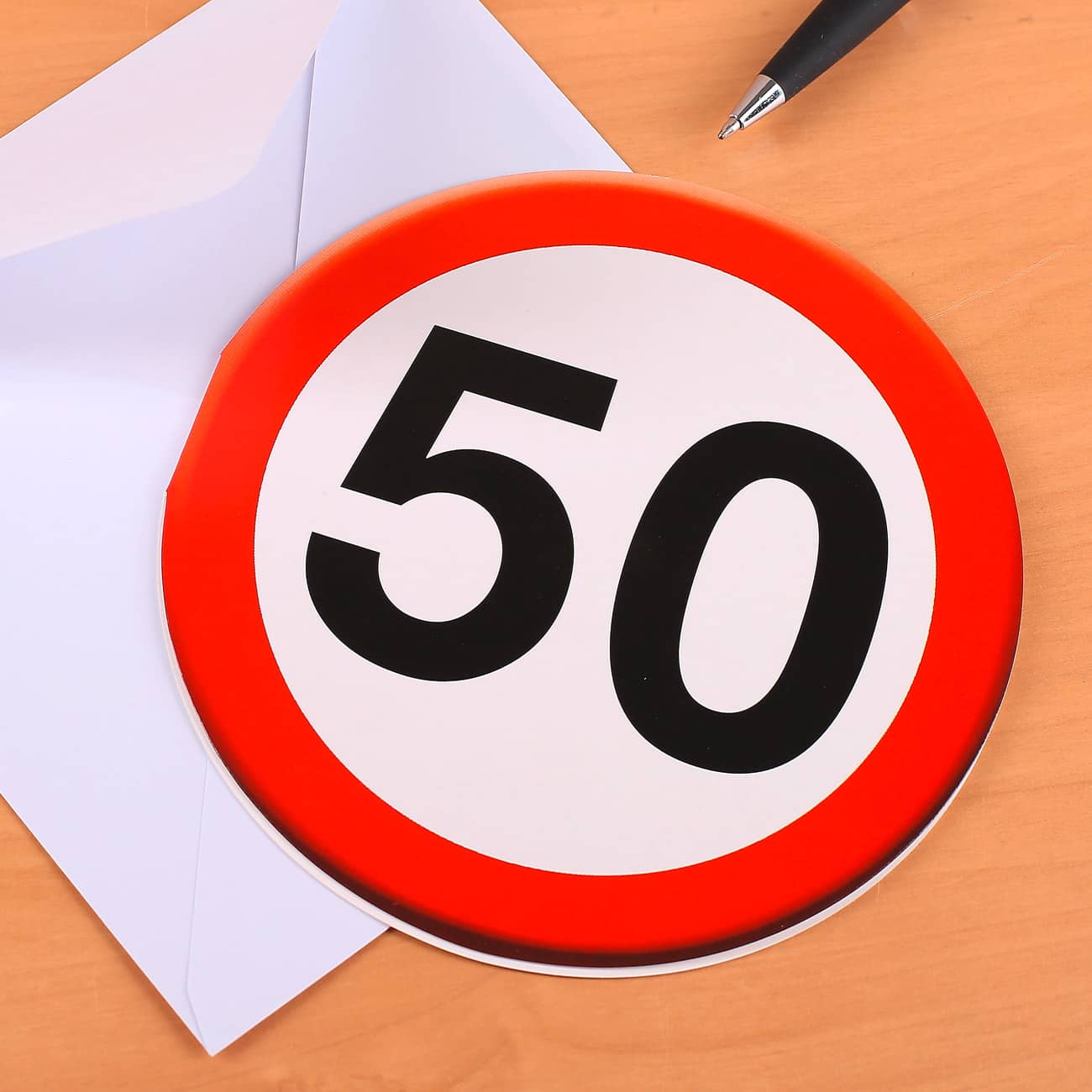 Diese Glückwunschkarte mit Verkehrszeichen verschenken Sie zum 50. Geburtstag. Die besondere runde Form mit rotem Rand und der Zahl 50 groß und schwarz in der Mitte wird den Jubilar oder die Jubilarin begeistern. Die beiden weißen Innenseiten können von Ihnen mit persönlichen Worten und Geburtstagsgrüßen beschriftet werden. Verschenken Sie diese ausgefallene Grußkarte zum 50. Geburtstag.