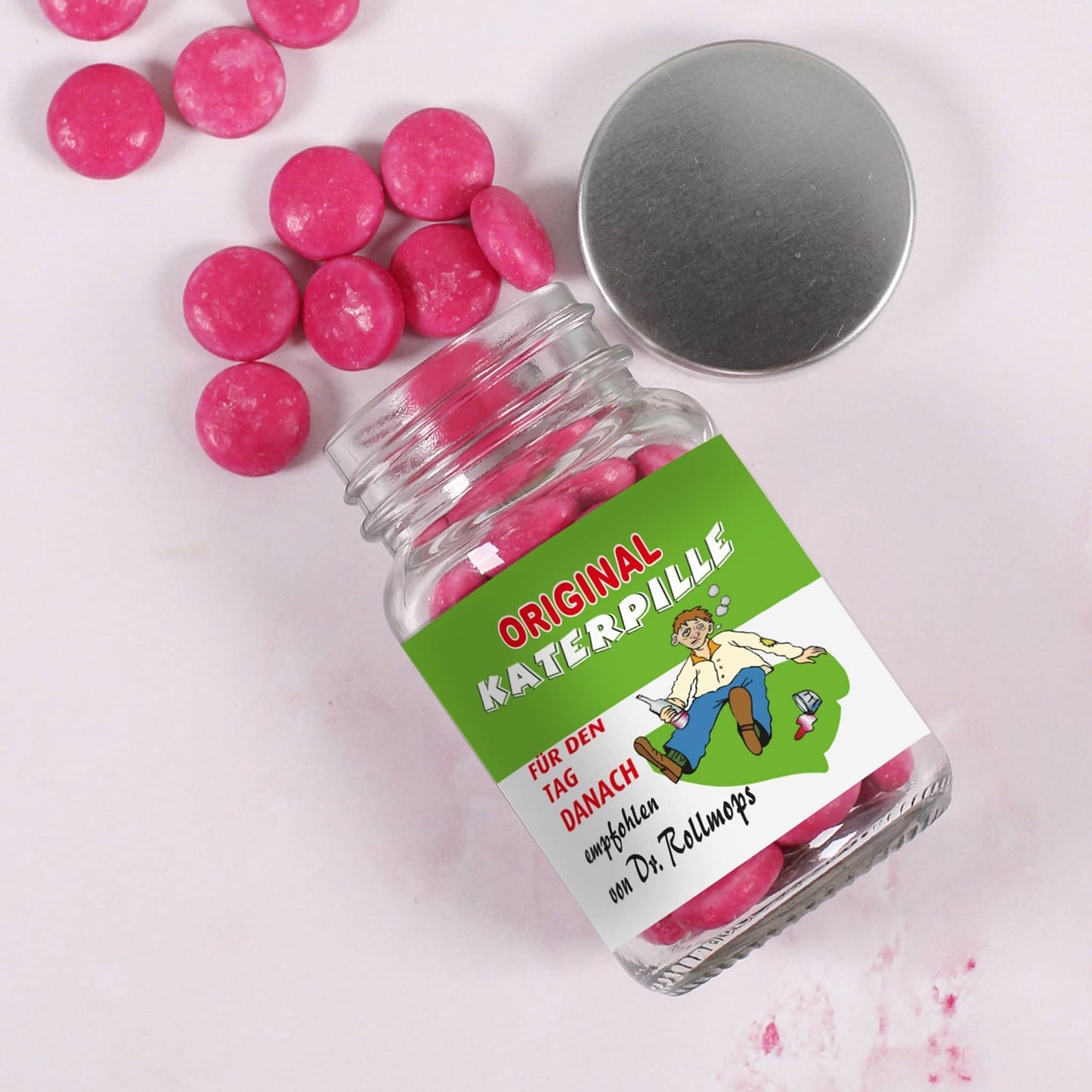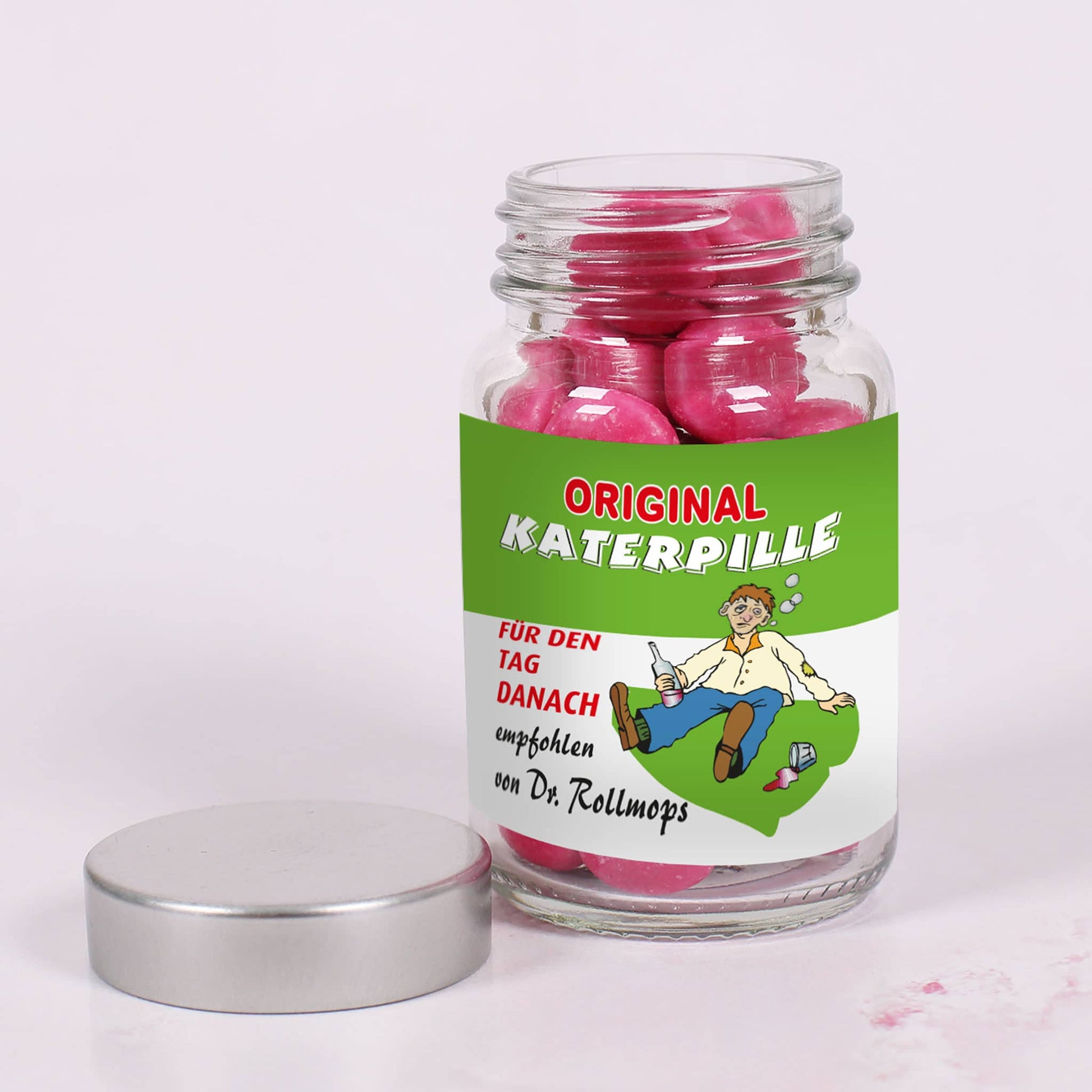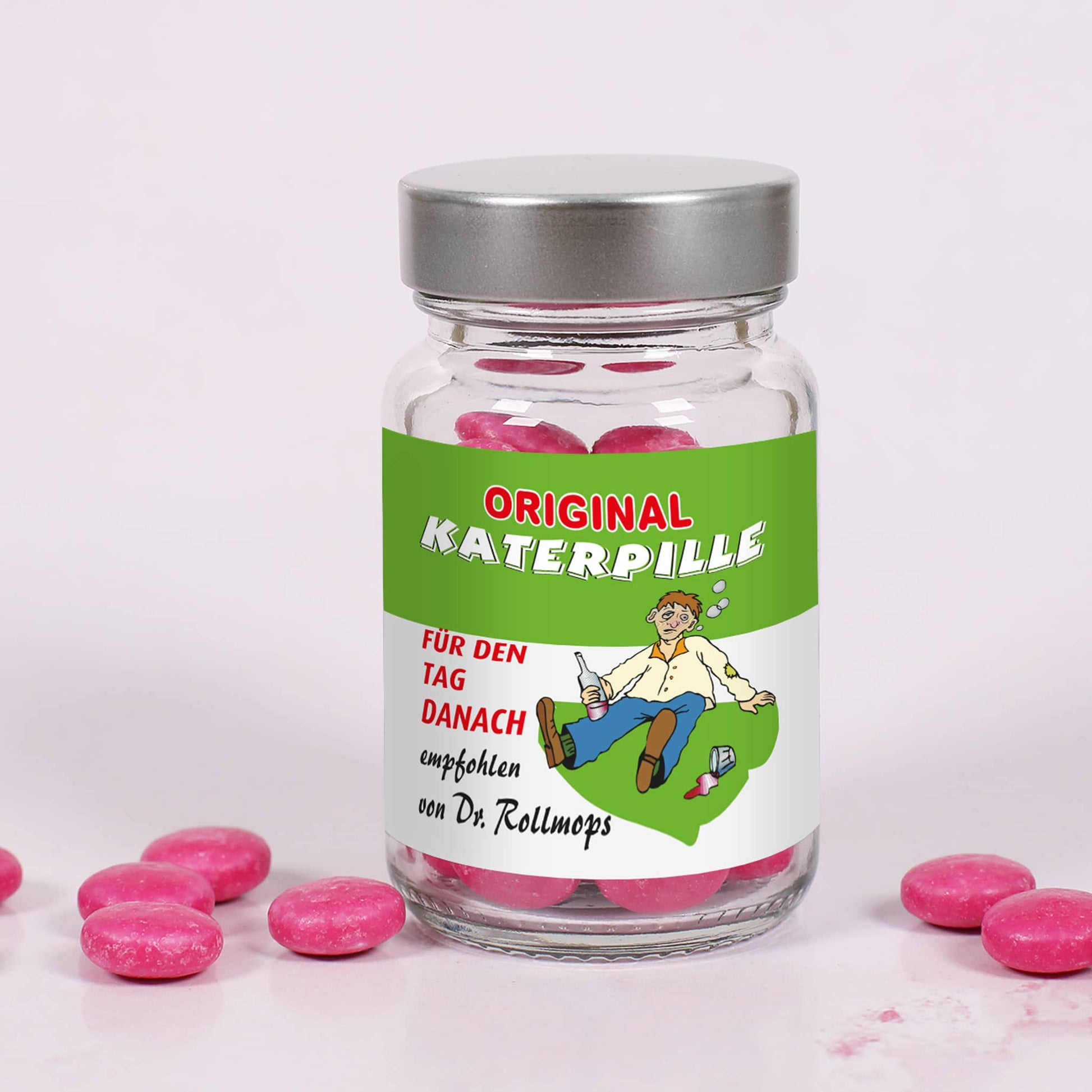 Diese Katerpillen werden von Dr. Rollmops! empfohlen. Die grünen Pillen aus der LUSTIGEN APOTHEKE sind keine Pharmazieerzeugnisse, sondern harmlose Traubenzuckerlinsen, aber Glaube versetzt ja bekanntlich BERGE! In einem Glas mit bedrucktem Etikett kommen die Pastillen zu Ihnen. Eine lustige Geschenkidee zum Geburtstag und anderen Anlässen.