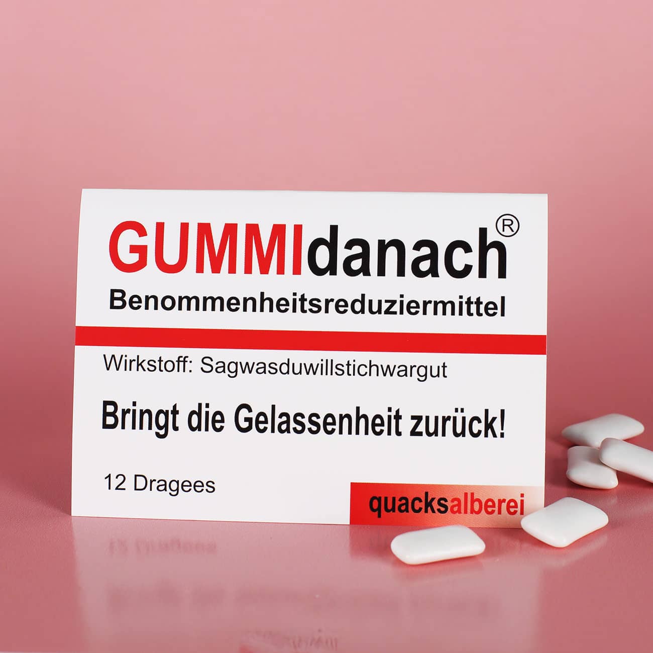 Verschenken Sie die Kaugummi Dragees mit der Aufschrift GUMMIdanach, wenn der oder die Beschenkte eine Portion Humor benötigt. Die witzige Aufschrift "GUMMIdanach" kann doppeldeutig verstanden werden, daher können Sie diese Kaugummis als Geschenk kreativ einsetzen. Hinzu kommen noch die Aufschriften "Benommenheitsreduziermittel", "Wirkstoff: Sagwasduwillstichwargut" und "Bring die Gelassenheit zurück". Enthalten sind in diesem Fantasie-Apothekenartikel der quacksalberei Dragees in Form von 12 Kaugummis mit erfrischendem Pfefferminz Geschmack. Diese bringen den Kopf sofort auf neue und frische Gedanken, so dass man sich kurz entspannen kann. Mit diesem lustigen Geschenk können Sie ohne Mühen viele zum Lachen bringen, egal ob Sie die Kaugummis alleine oder als Beigabe zu einem großen Geschenk überreichen.