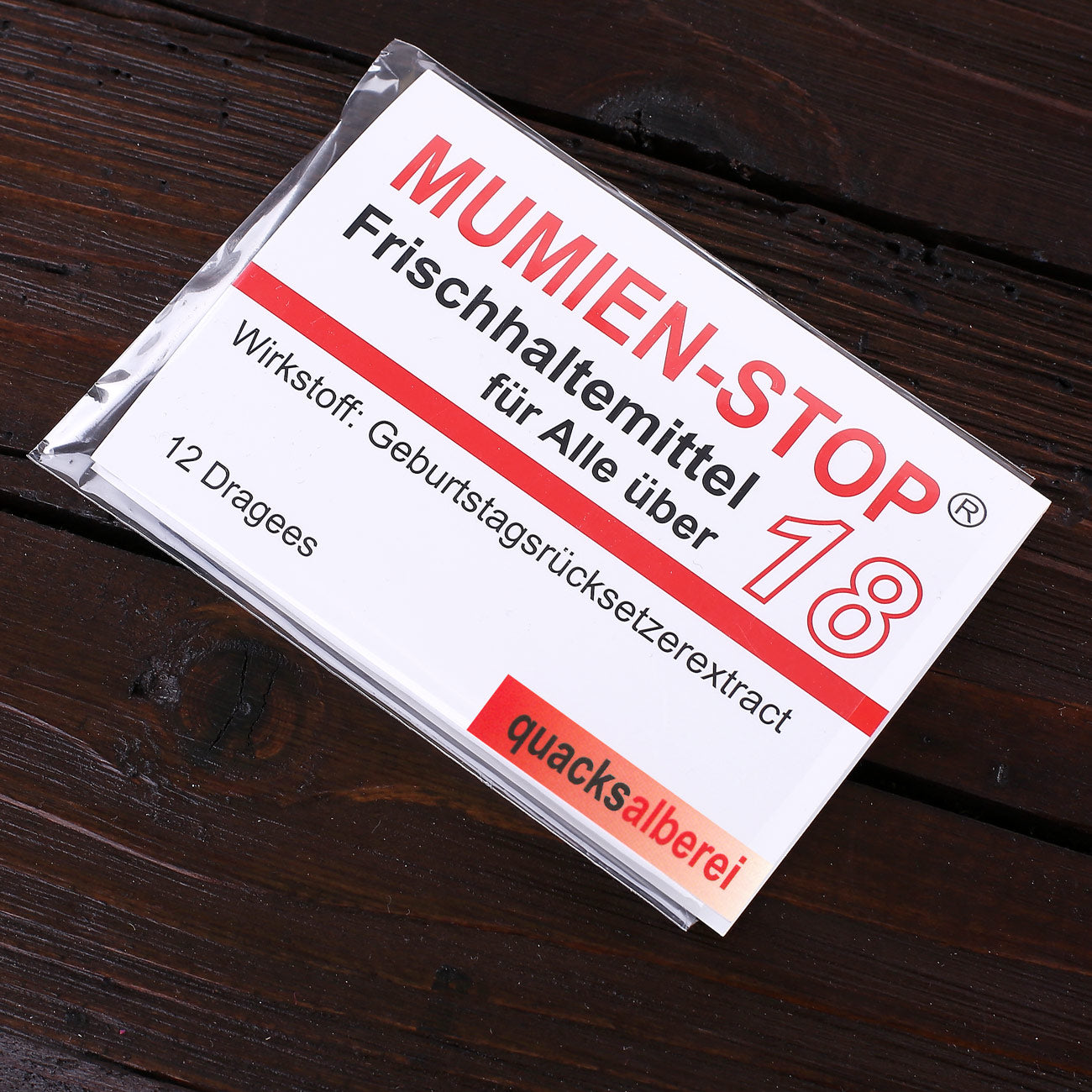 Eine humorvolle Geschenkidee zum 18. Geburtstag ist dieses Frischhaltemittel gegen das Älter werden. Die Mumien-Stop Kaugummis enthalten nämlich einen ganz effizienten Wirkstoff - Geburtstagsrücksetzerextract.