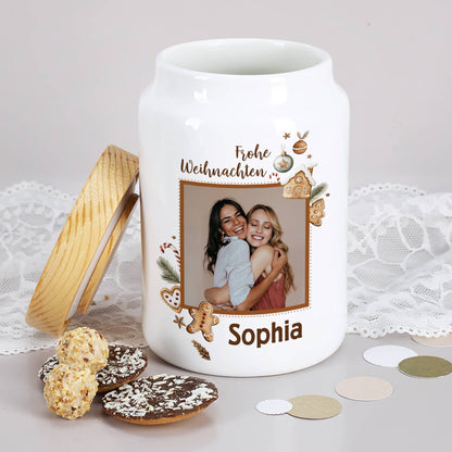 Diese bedruckte Keksdose aus hochwertiger Keramik ist das perfekte Weihnachtsgeschenk für alle, die persönliche und stilvolle Geschenke lieben. Mit einem schicken Holzdeckel und einem individuellen Aufdruck, der ein Lebkuchenmotiv, ein Foto nach Wunsch sowie den Namen der beschenkten Person enthält, wird die Dose zu einem besonderen Highlight in jeder Küche – nicht nur zur Weihnachtszeit! Ob gefüllt mit selbstgebackenen Plätzchen oder anderen Leckereien, die personalisierte Keksdose macht das Naschen noch schöner und bringt weihnachtliche Gemütlichkeit in jedes Zuhause.