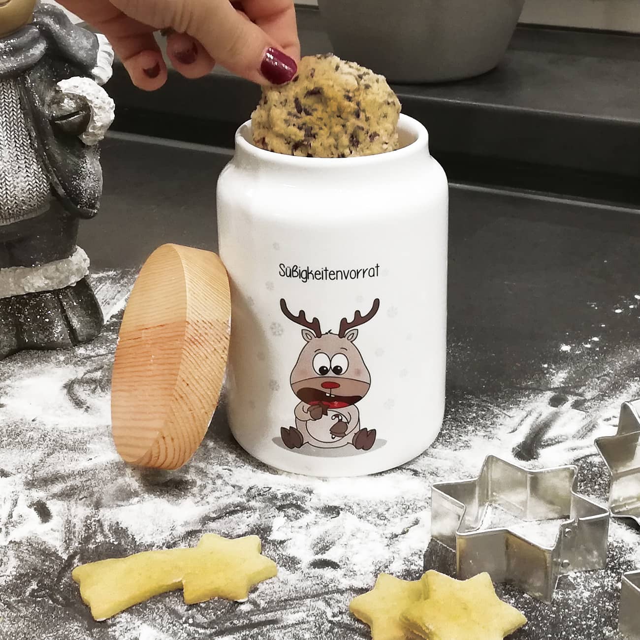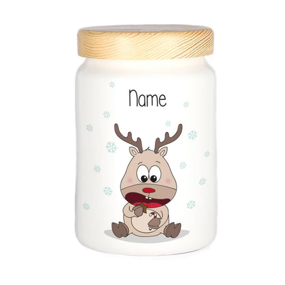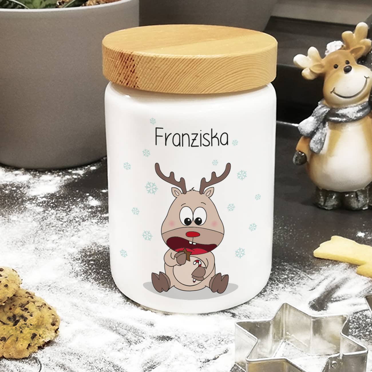 Die weiße Keramikdose mit Holzdeckel wird mit dem süßen Rentier bedruckt. Das kleine Rentier nascht fröhlich seine Lebkuchensterne. Um ihn herum fliegen zahlreiche Schneeflocken. Über dem Rentier wird Ihr Wunschname platziert.