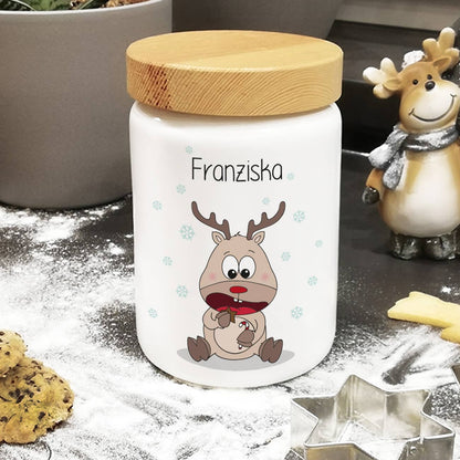 Keksdose mit niedlichem Rentier und Ihrem Namen
