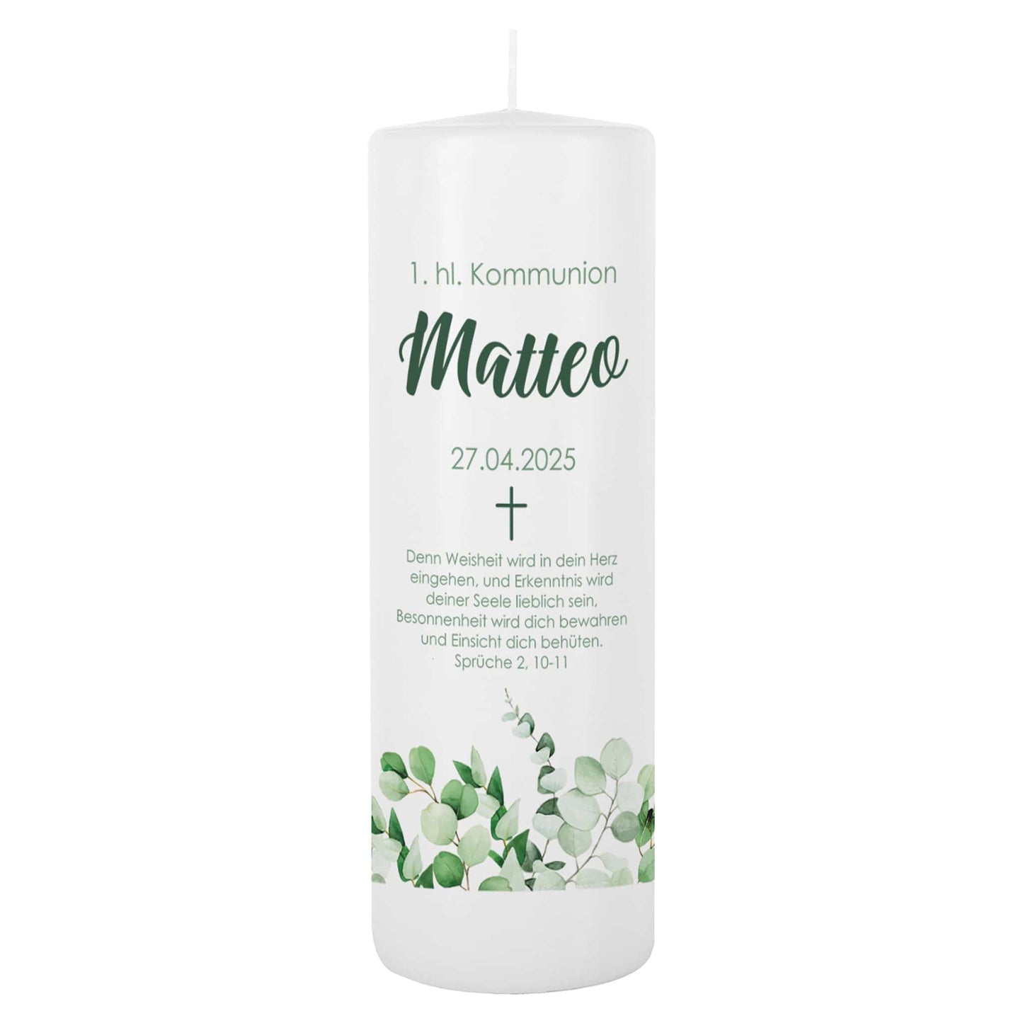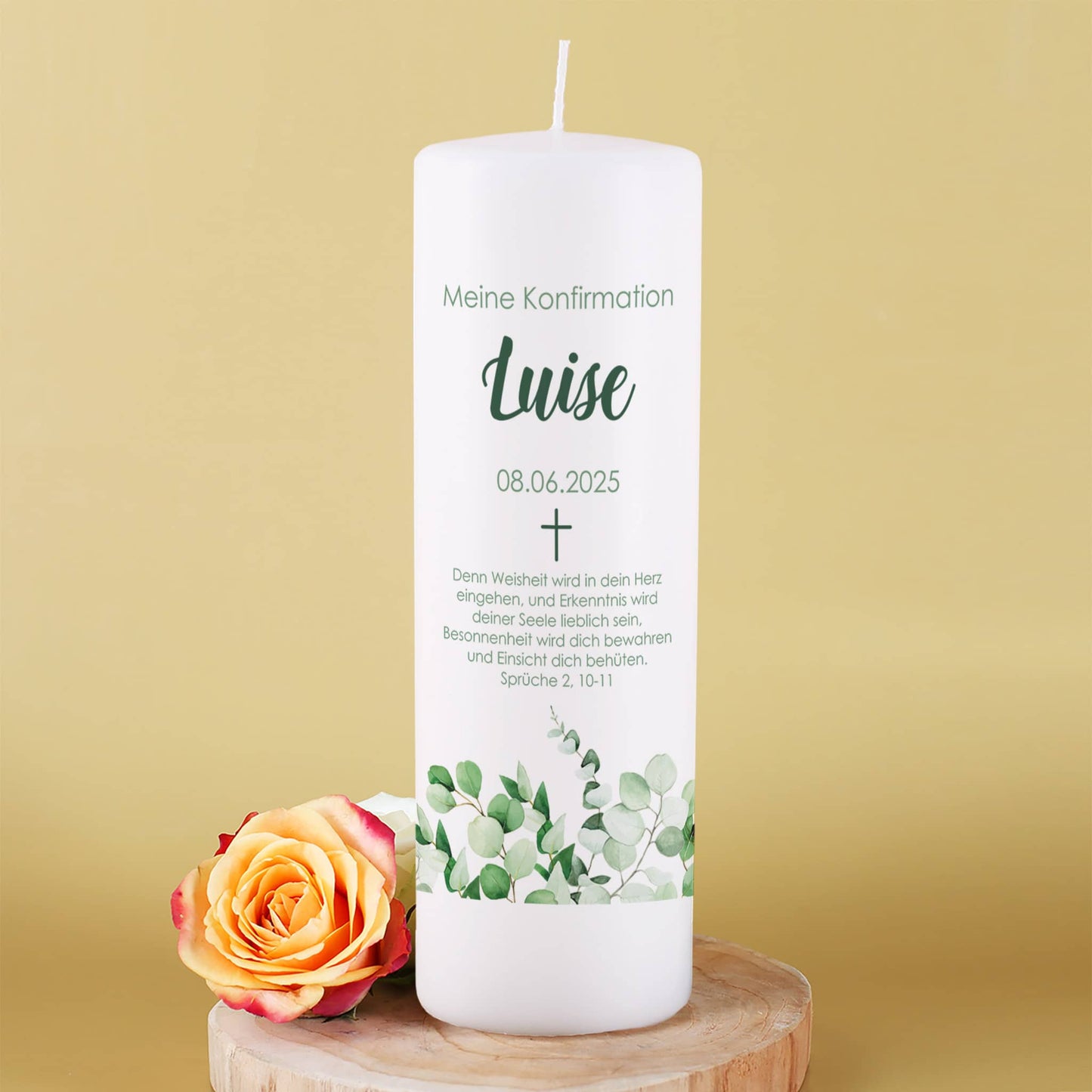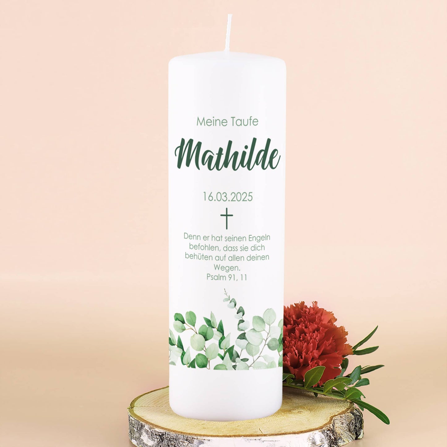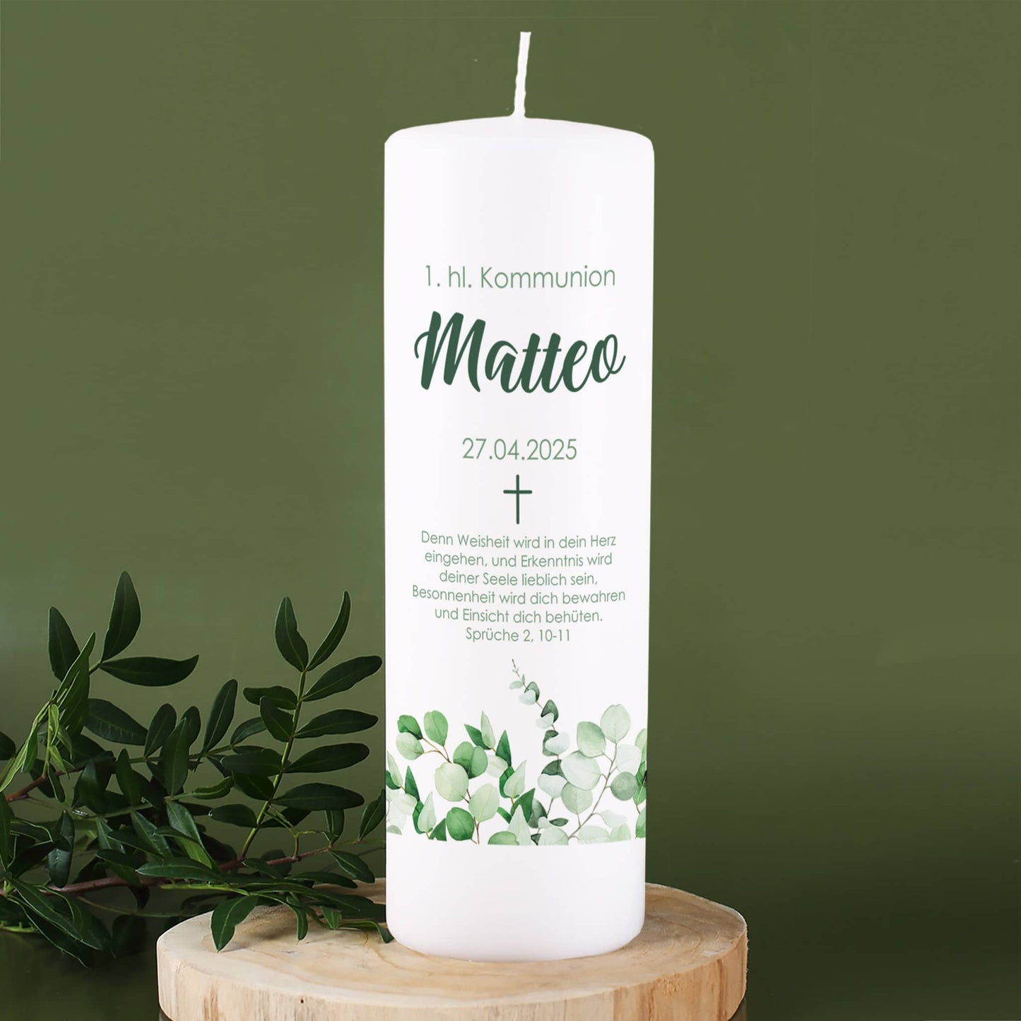 Kerze mit Eukalyptusmotiv zur Taufe, Kommunion oder Konfirmation