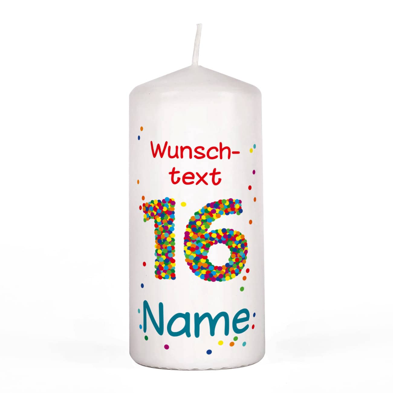Mit der bunten Kerze zum 16. Geburtstag möchte man am liebsten gleich die Party starten. Die vielen bunten Konfetti-Punkte bilden eine große 16 und werden mit Ihrem gewünschten Namen und Glückwunschtext ergänzt. Mit diesem Geburtstagsgeschenk können Sie ganz einfach überzeugen.