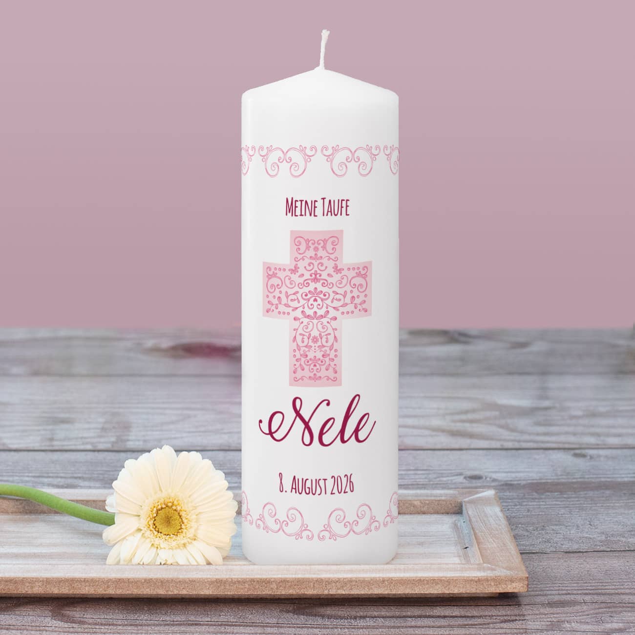 Kerze zur Taufe, Kommunion oder Konfirmation mit Name, Datum, Wunschtext in rosé, 25 x 8 cm