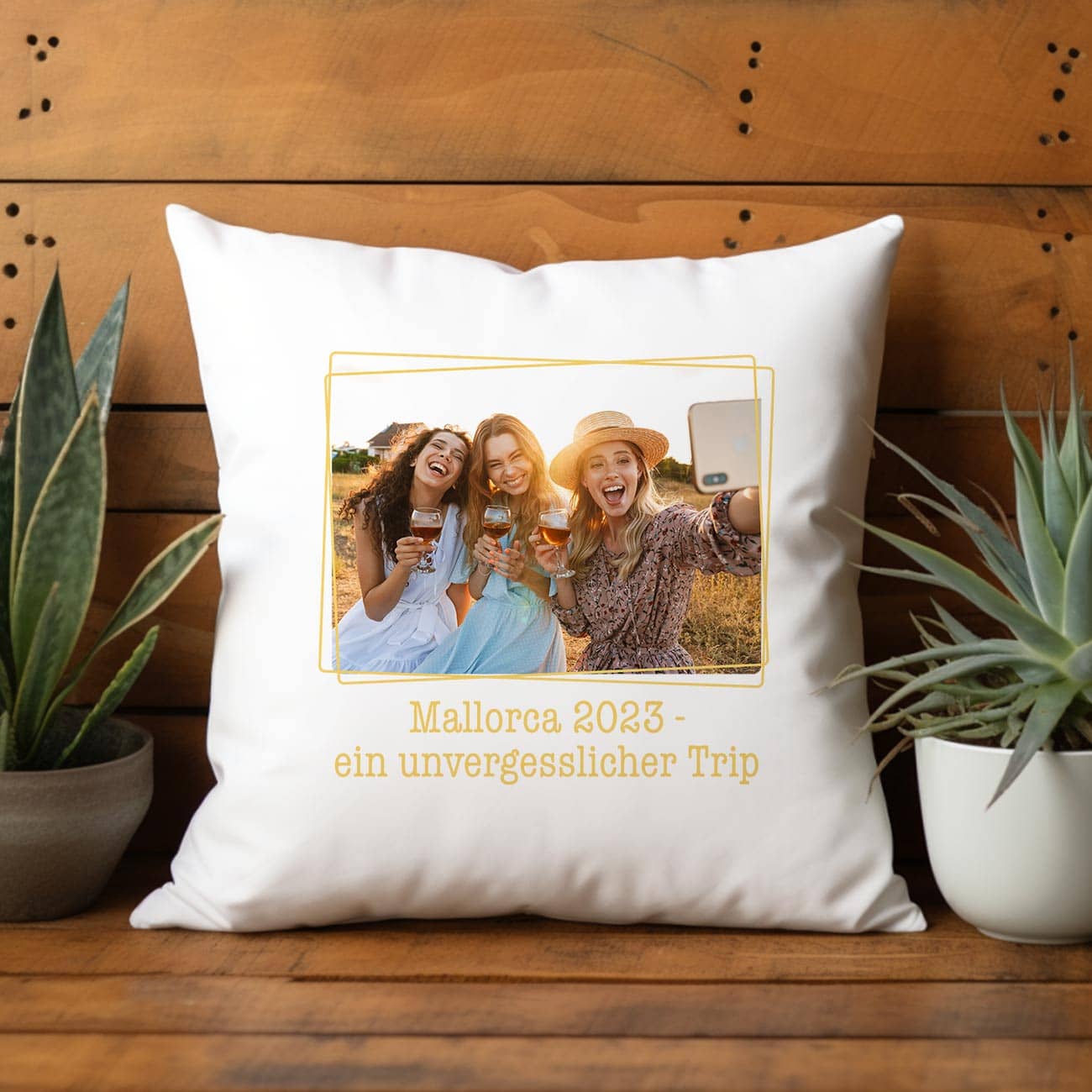 Dieses Kissen mit Foto glänzt mit einer hochwertigen Qualität. Die Kissenhülle besteht aus strapazierfähigem 100% Polyester und die Füllung aus Polyester-Spinnvlies. Dank der Waschbarkeit bis 40°C bleibt das Kissen auch nach häufigem Gebrauch und Waschen in lebendigen Farben erhalten. Egal ob zu Hause oder auf Reisen, dieses individuell gestaltete Kissen lädt zum Kuscheln und Verweilen ein, während es gleichzeitig Ihre kostbaren Erinnerungen zum Strahlen bringt. Unser Konfigurationstool ist kinderleicht zu bedienen, was das Erstellen Ihres bedruckten Kissens besonders einfach macht. Also zögern Sie nicht und setzen Sie Ihre Geschenkideen schnell mit ein paar Klicks um!