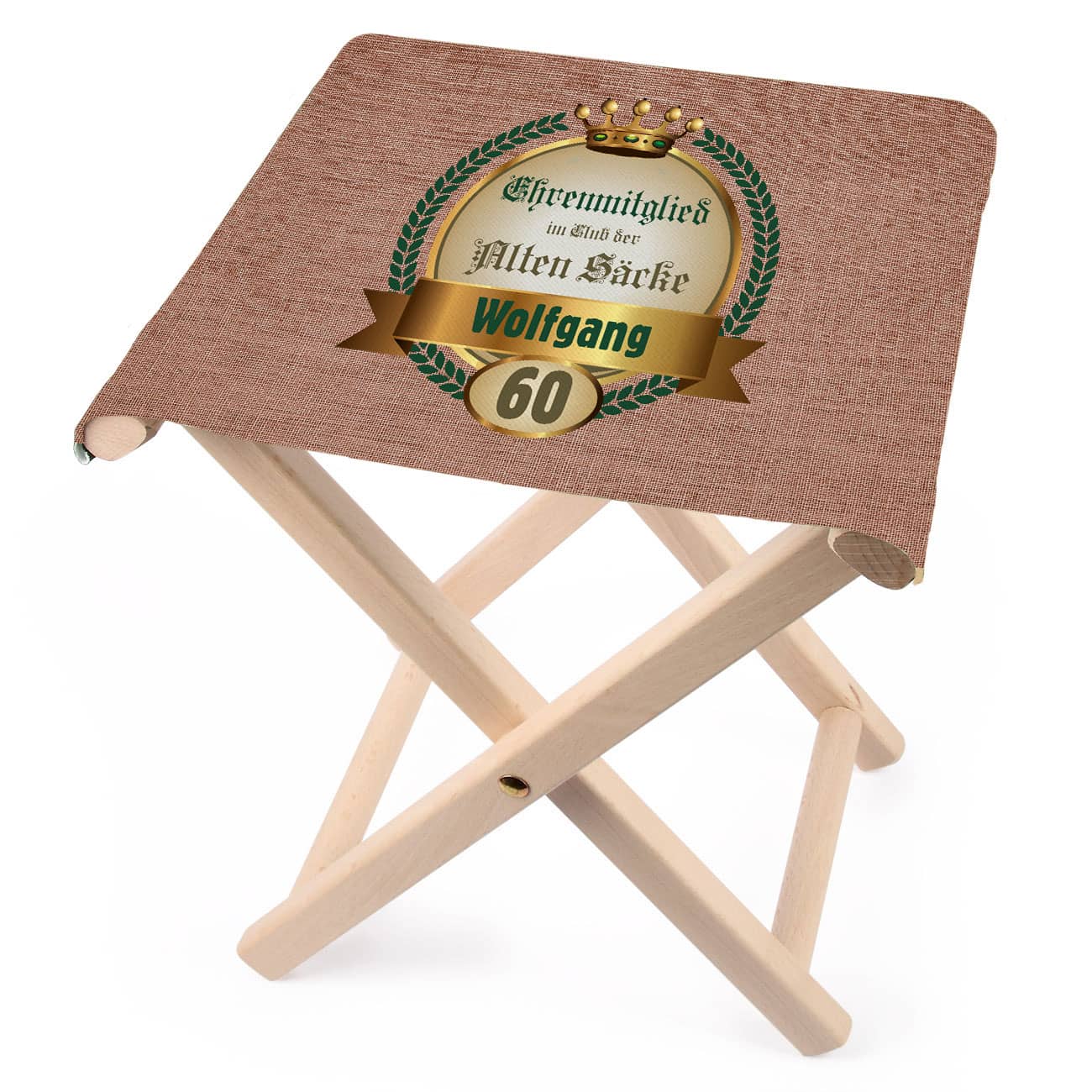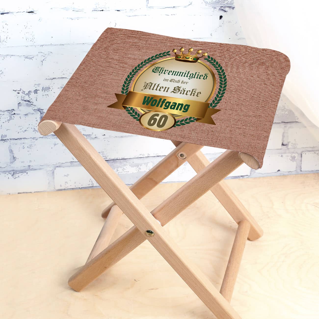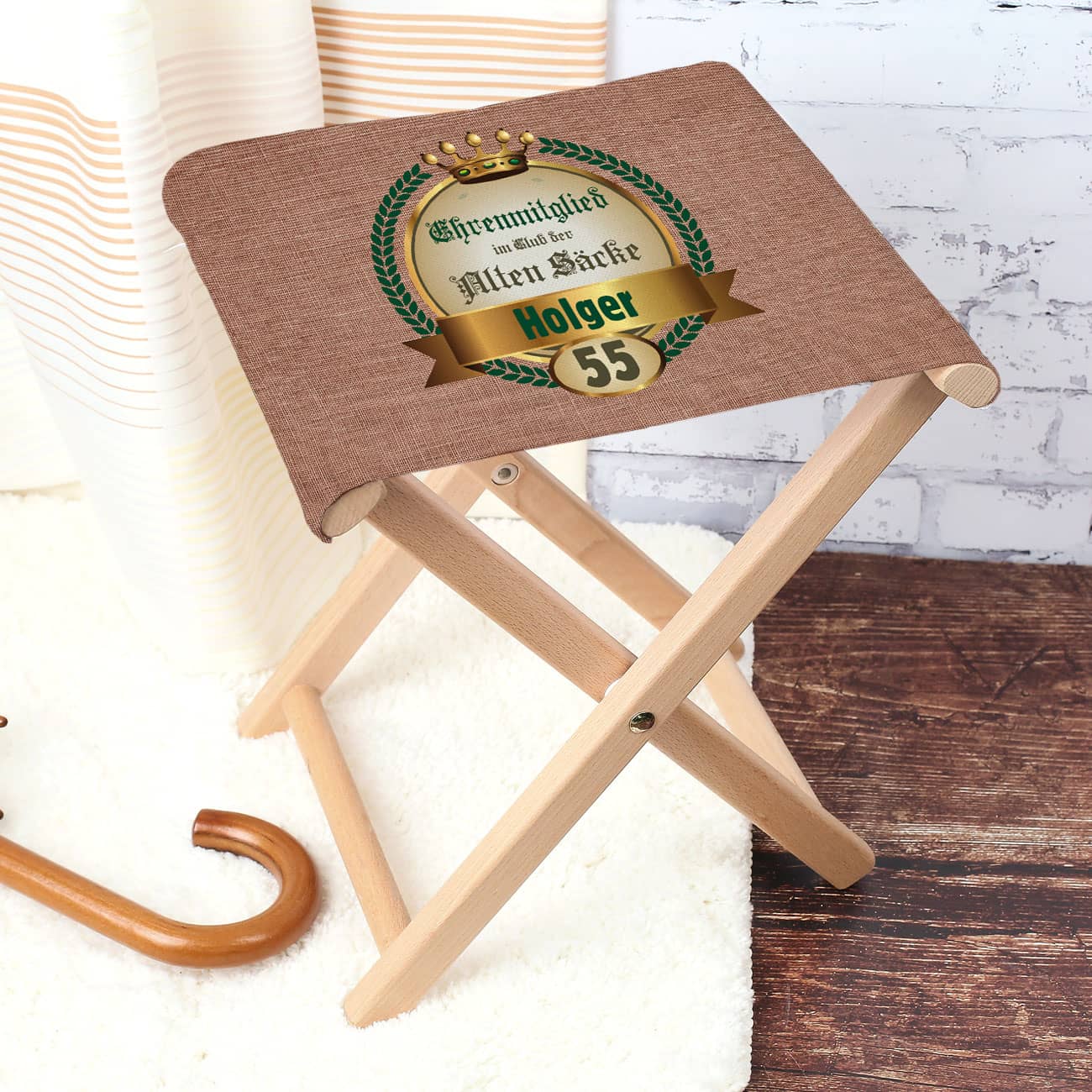 Hier kommt der Thron für den reifen Herrn. Er bekommt ihn überreicht zur Aufnahme in den Club der alten Säcke. Und wenn die Beine mal nicht mehr so wollen wie sie sollen, dann einfach den Hocker aufstellen und Pause machen. Der Name und das Alter stehen natürlich auch mit drauf. So kann er nicht verwechselt werden und die Ehrenmitgliedschaft ist immer gut sichtbar.