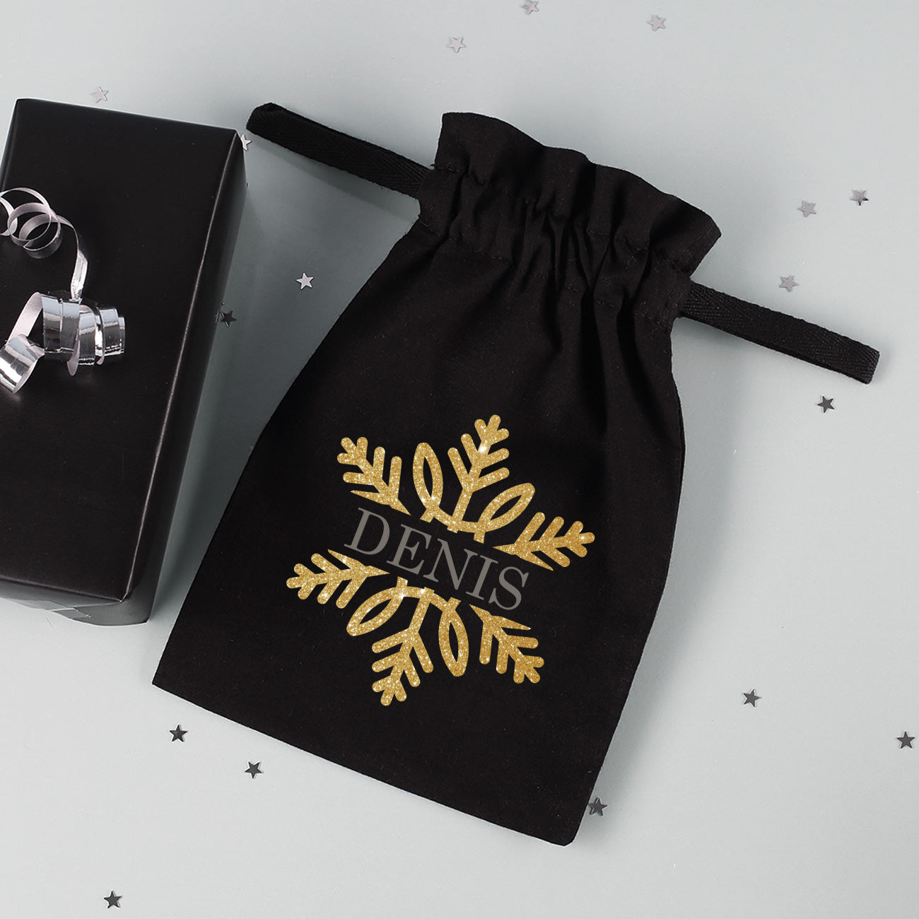 Benötigen Sie noch eine besondere Geschenkverpackung für Ihre kleinen Weihnachtsgeschenke, Wichtelgeschenke oder Nikolausgeschenke, dann ist dieser schwarze Geschenksack genau das Richtige! Er besteht aus organischer Baumwolle in Schwarz und erhält einen persönlichen Druck, der eine goldene Schneeflocke und einen Text nach Ihrem Wunsch abbildet. Halten Sie hier den Namen der beschenkten Person fest, damit unter dem Weihnachtsbaum sofort zu erkennen ist, für wen dieser Geschenksack gedacht ist. Eine schöne Verpackung für Weihnachtsgeschenke wird garantieren, dass der erste Eindruck mehr als positiv sein wird.