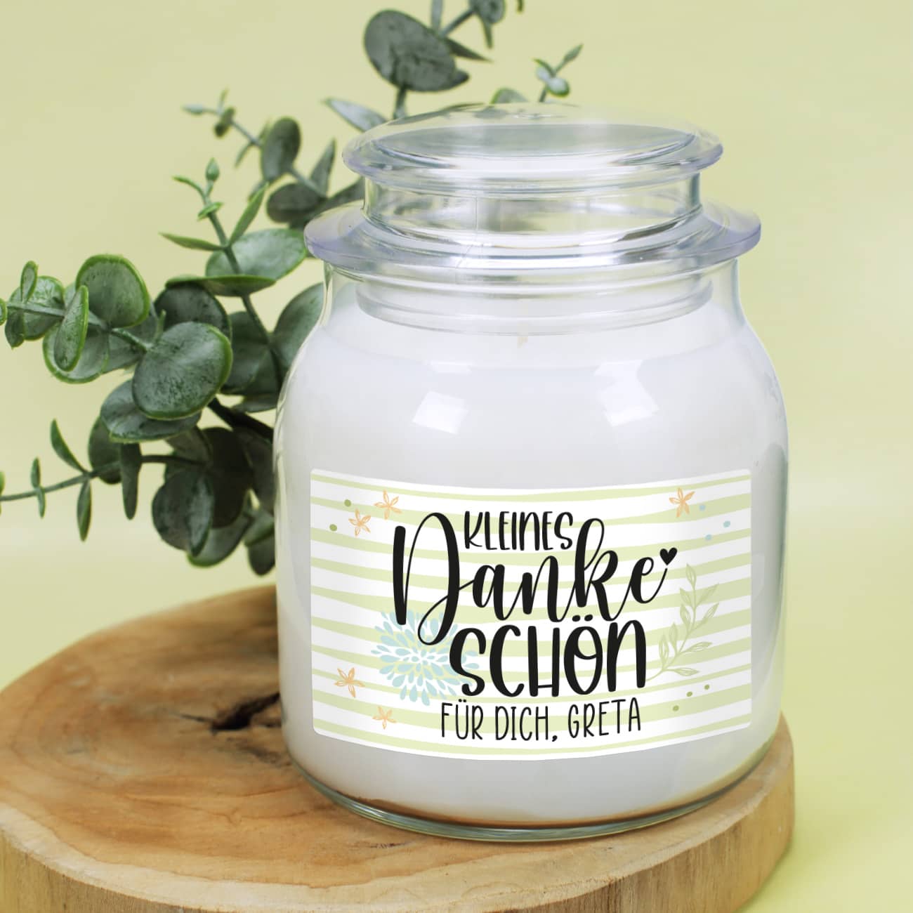Eine Kleinigkeit um Danke zu sagen! Machen Sie jemandem eine Freude mit unserer hübschen Duftkerze im schicken Deckelglas als kleines Dankeschön mit persönlichem Etikett. Das in Weiß und Pastellgelb gestreifte Etikett wird mit Blüten und dem Schriftzug "Kleines Dankeschön" bedruckt. Hinzu kommt noch ein Text nach Ihrem Wunsch, in dem Sie ein paar liebe Worte oder den Grund für dieses Dankeschön Geschenk festhalten können. Danken Sie Ihrer Mama dafür, dass sie immer für Sie da ist, einer Kollegin, weil Sie immer Ihre Schichten übernimmt, wenn was dazwischen kommt oder Ihrer besten Freundin, weil diese jederzeit ein offenes Ohr für Ihre Sorgen hat. Gründe für ein Dankeschön Geschenk lassen sich immer finden! Mit personalisierten Geschenken wie dieser Duftkerze zeigen Sie, dass Sie die beschenkte Person wertschätzen.