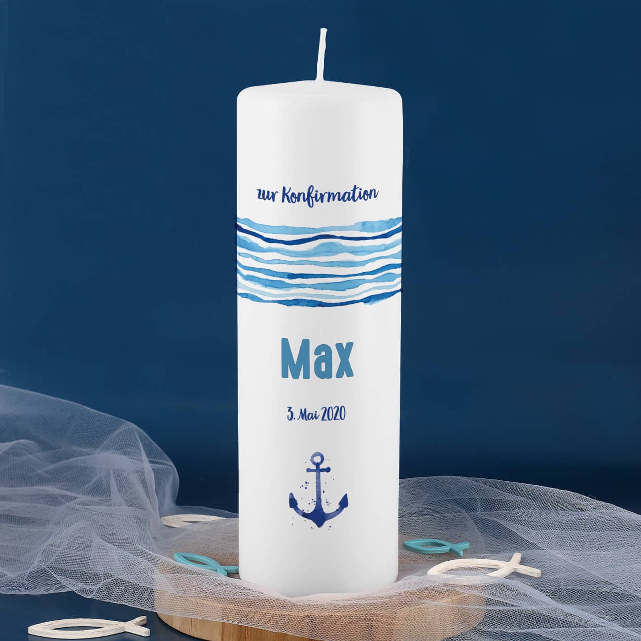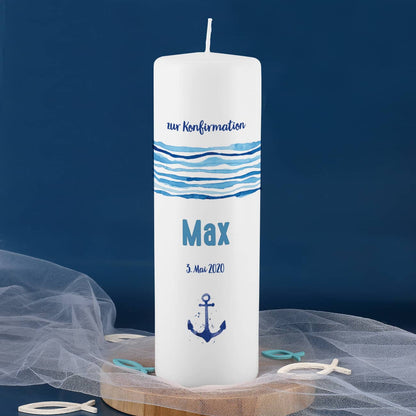 Während das Wasser im christlichen Glauben für Reinheit und neues Leben steht, symbolisiert der Anker Hoffnung und Halt. Auf dieser Konfirmationskerze ist beides in einer modernen Watercolor Interpretation abgebildet. Über dem Wasser steht der Text zur Konfirmation und darunter folgt der Name des Konfirmanden sowie das Datum der Konfirmation. Ein Zitat aus der Bibel oder ein ganz persönlicher Glückwunschtext findet auf der Rückseite der Kerze Platz.