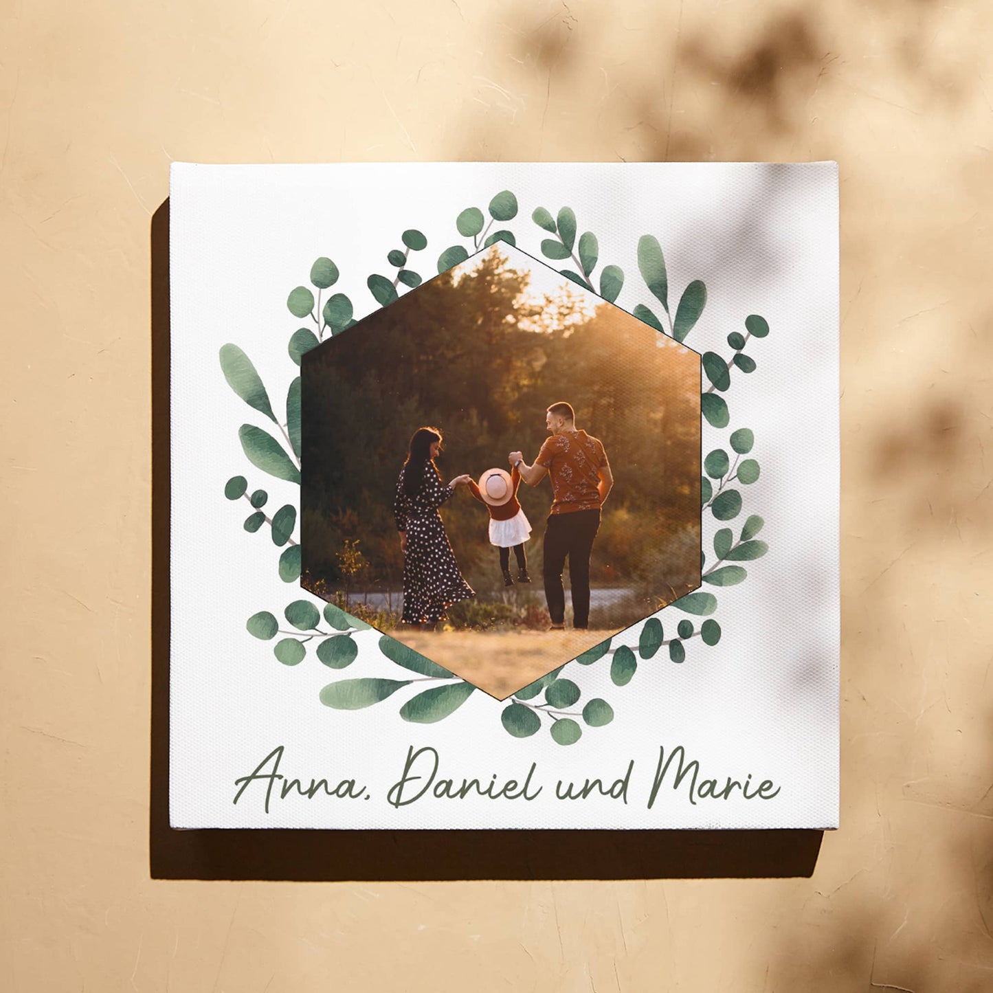 Halten Sie Ihre wertvollsten Familienmomente auf dieser personalisierten Fotoleinwand fest! Die Leinwand wird mit Ihrem Lieblingsfoto und einem wundervollen Eukalyptuskranz als Rahmen gestaltet. Zusätzlich wird sie mit einem persönlichen Wunschtext wie dem Familiennamen oder einem besonderen Spruch veredelt, was sie zu einem einzigartigen Geschenk macht. Ob für das eigene Zuhause oder als Geschenk für Freunde und Familie – diese Fotoleinwand ist eine liebevolle und dekorative Erinnerung, die jeden Raum verschönert.