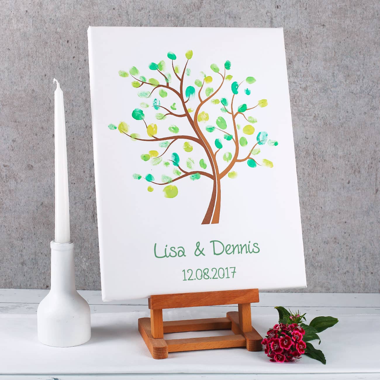 Unsere weiße Leinwand wird mit einem Baum ohne Blätter, den Namen des Hochzeitspaares und dem Hochzeitsdatum bedruckt. Die Blätter können dann von den Gästen mit Ihren Fingerabdrücken um den Baum herum angeordnet werden. So kann sich jeder Gast ganz persönlich auf der Leinwand verewigen. Sie können auch noch zu den Abdrücken den Namen der Gäste aufschreiben, damit die Leinwand zu einem ausgefallenen "Gästebuch" wird.