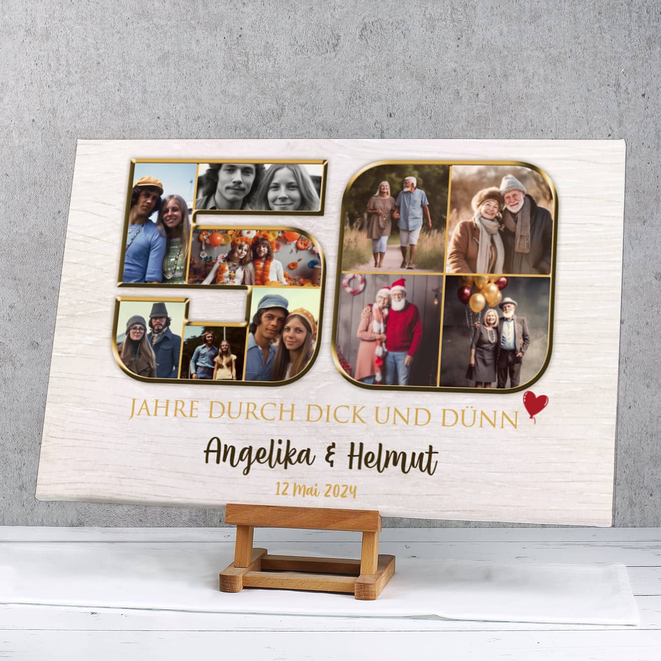 Unvergessliche Momente in einer einzigartigen Fotoleinwand festhalten – das ist das perfekte Geschenk für das 50. Hochzeitsjubiläum, die Goldene Hochzeit. Diese Fotoleinwand im Maß von 60 x 40 x 2 cm bietet Platz für 10 besondere Fotos aus den gemeinsamen Jahren des Ehepaares. Diese werden kunstvoll zu einer großen "50" arrangiert, um diesen wunderbaren Meilenstein zu feiern. Aber das ist noch nicht alles! Neben den Bildern können Sie auch drei Zeilen Text nach Ihren Wünschen hinzufügen. Seien es liebevolle Worte, persönliche Glückwünsche oder Erinnerungen – Ihrer Kreativität sind keine Grenzen gesetzt. Verschiedene Schriftarten und Farben stehen zur Auswahl, sodass Sie die Gestaltung ganz nach Ihrem Geschmack anpassen können.
