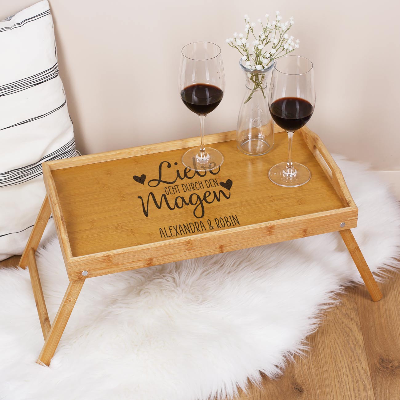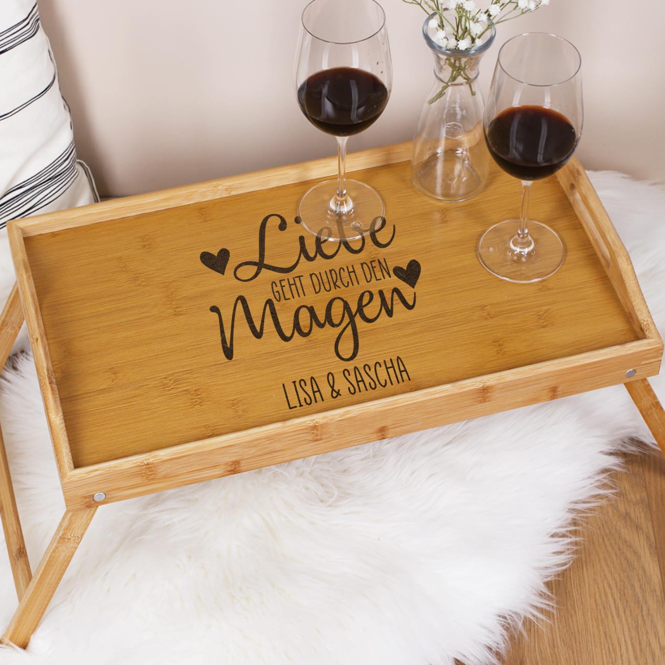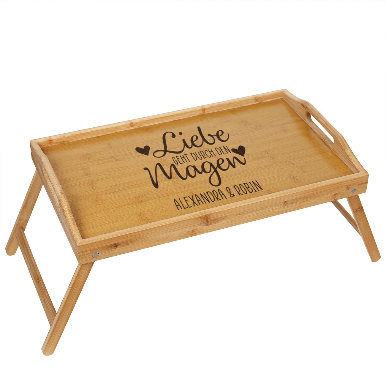 Überraschen Sie Ihren Liebsten oder Ihre Liebste zum Hochzeitstag, Jahrestag oder Valentinstag mit einem leckeren Frühstück im Bett. Unser Bambustablett mit Tischfunktion ist perfekt dafür geeignet, um die beste Mahlzeit aller Zeiten am Morgen zu servieren. Mit ein paar warmen Brötchen, einem heißen Kaffee, einem erfrischenden Orangensaft und etwas Obst und Gemüse ist die Überraschung mit dem Bambustablett komplett. Das Highlight auf dem Betttisch ist aber die personalisierte Gravur, die sich in einem schönen Weiß auf dem Holz abzeichnet. Zu lesen ist der Spruch "Liebe geht durch den Magen", der mit Namen nach Wunsch ergänzt wird.