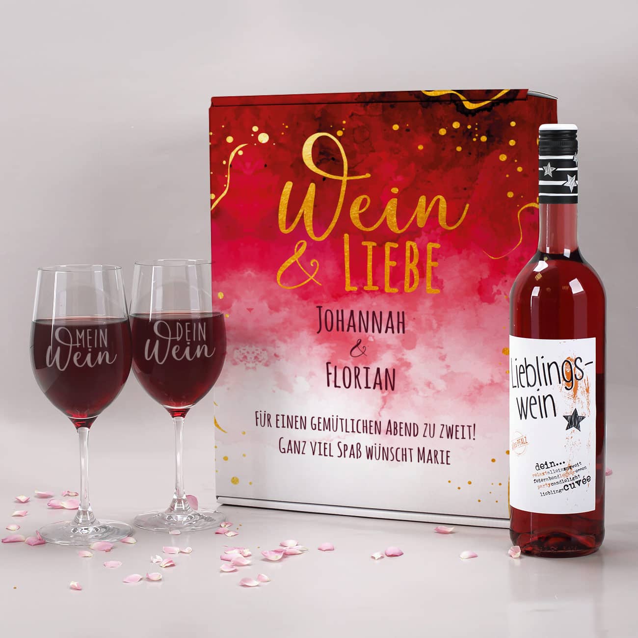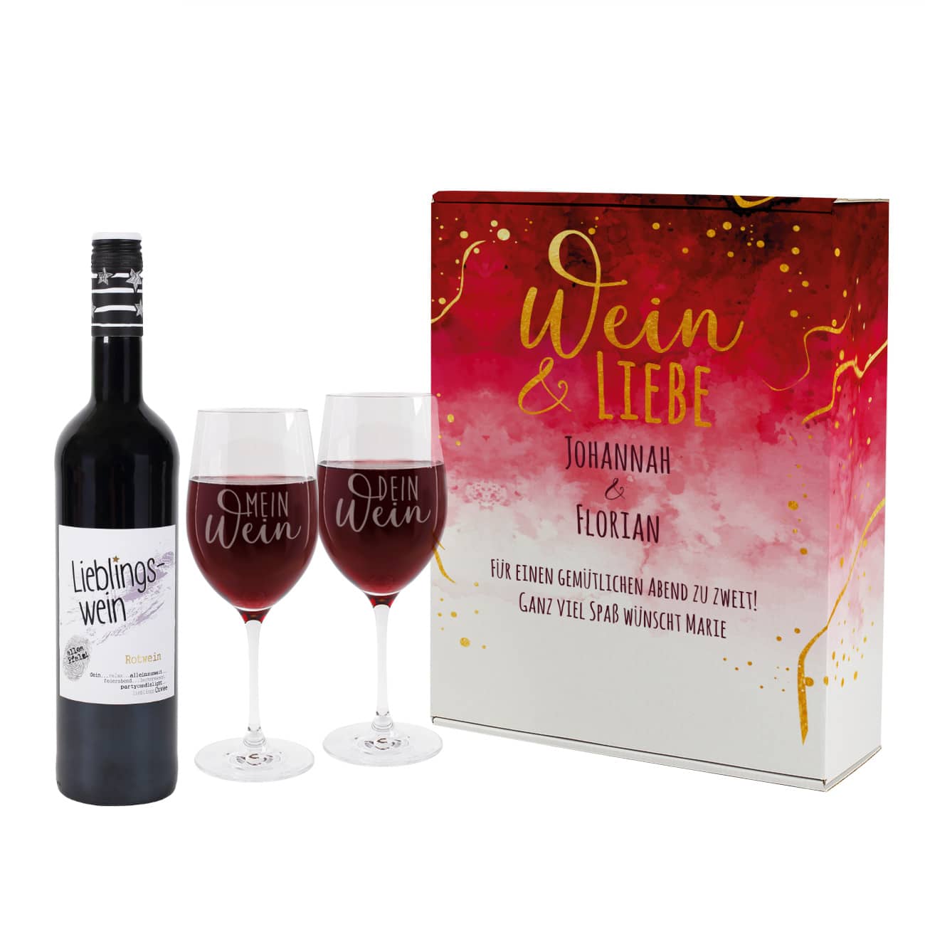 Liebe und Wein - Wein Geschenkset mit zwei gravierten Weingläsern und Biorebe-Wein