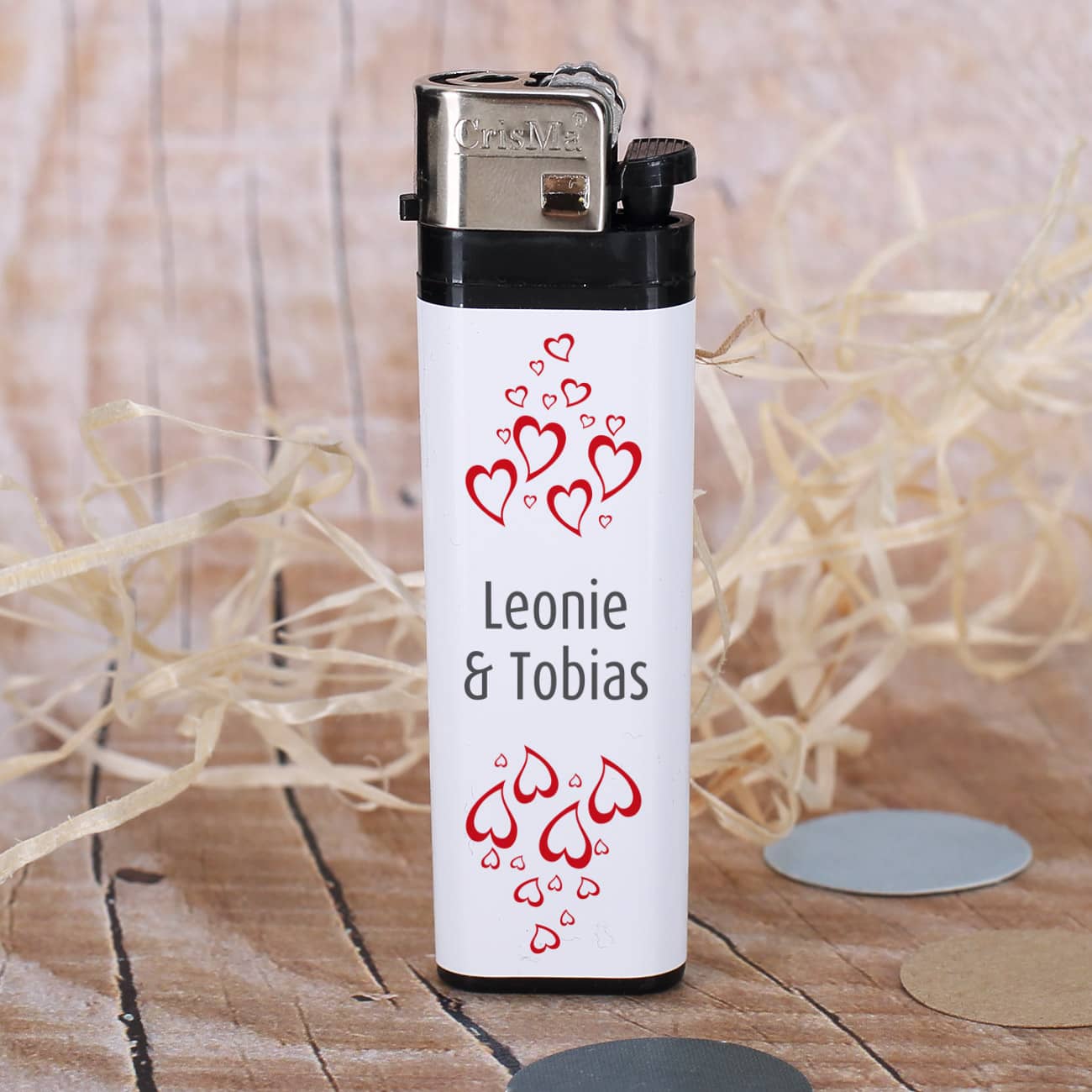 Ein schönes Symbol der flammenden Liebe bildet dieses Feuerzeug mit Herzen als Motiv. Bedruckt wird es mit den Namen des Paares, so dass es sich wunderbar für romantische Anlässe handelt. Beschenken Sie beispielsweise Ihren Schatz zum Valentinstag oder Jahrestag. Es ist auch eine wunderbare Ergänzung für die Hochzeitskerze, um diese auf der Feier zu entzünden. Bestellen Sie das Feuerzeug als kleines Mitbringsel und Hochzeitsgeschenk oder nutzen Sie es als raffiniertes Gastgeschenk für Ihre eigene Feier. So haben die Gäste eine kleine Erinnerung, die sie mit nachhause nehmen können!