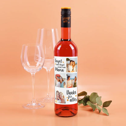 Auf dem sehr schön gestalteten Etikett des Weins für Ihre Mutter können Sie die schönsten Bilder von Ihrer Mutter, sich selbst, Ihren Geschwistern und der ganzen Familie festhalten. Ob Kindheitsfotos oder aktuelle Bilder - suchen Sie sich die besten vier Fotos aus Ausflügen, dem Urlaub oder anderen schönen Tagen aus, um Sie auf die Flasche drucken zu lassen. Sie haben freie Wahl und wissen am besten, welche Fotos Ihrer Mutter besonders wichtig sind. Der Schriftzug "Engel ohne Flügel nennt man Mama - Danke für alles" rundet die Bilderauswahl ab. Mit diesem Satz lässt sich das Verhältnis zwischen einer Mutter und ihren Kindern sehr gut beschreiben. Der Rest des Etiketts ist in schlichten Schwarz-, Weiß- und Gelbtönen gehalten, damit die Fotos der Blickfang auf dem Etikett bleiben. Dieser Wein ist noch nicht das ganz Richtige? Dann schauen Sie sich weitere Wein Geschenke unter der verlinkten Rubrik an.