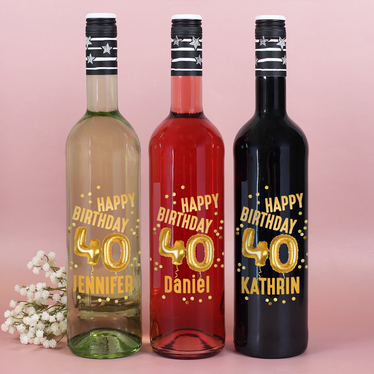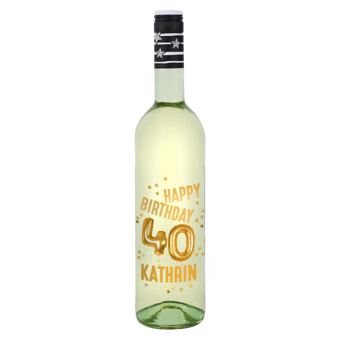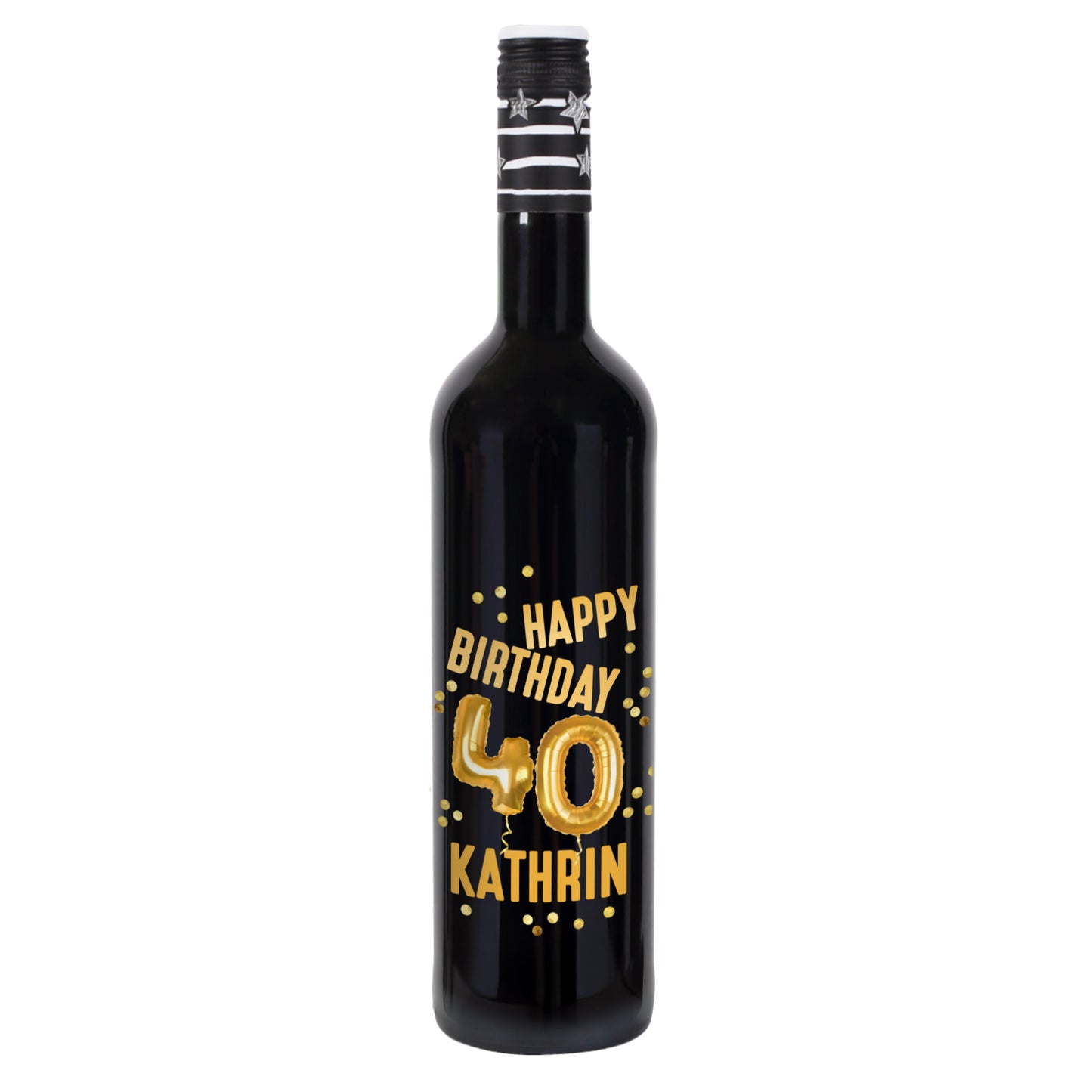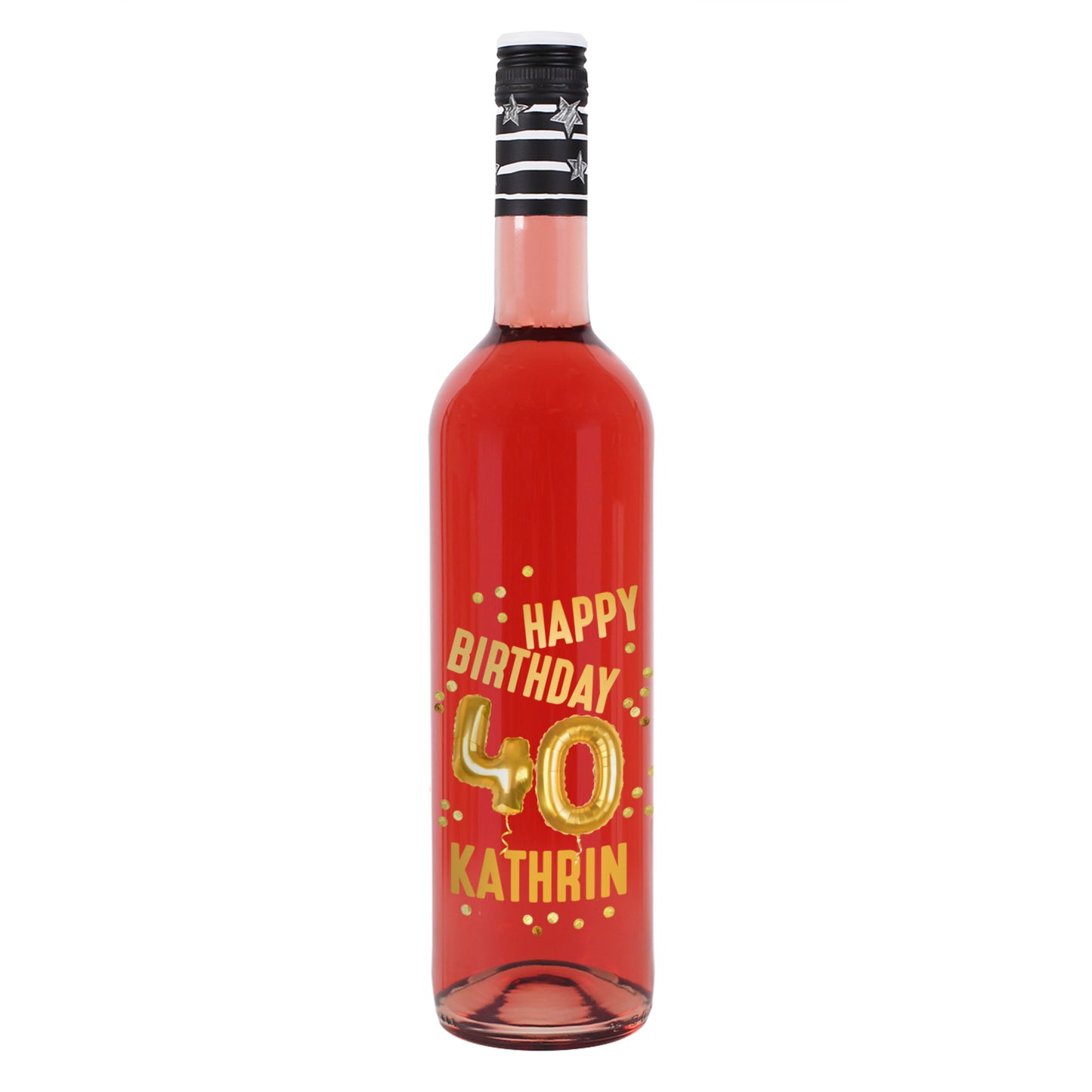 Diese stilvolle Weinflasche ist ein ganz besonderes Geburtstagsgeschenk: Sie trägt den goldenen Schriftzug „Happy Birthday“, funkelnde Luftballons und die Zahl 40 – dazu wird sie mit einem Wunschnamen personalisiert. So wird jede Flasche zum einzigartigen Highlight auf der Party oder als edles Präsent für den Jubilar oder die Jubilarin.