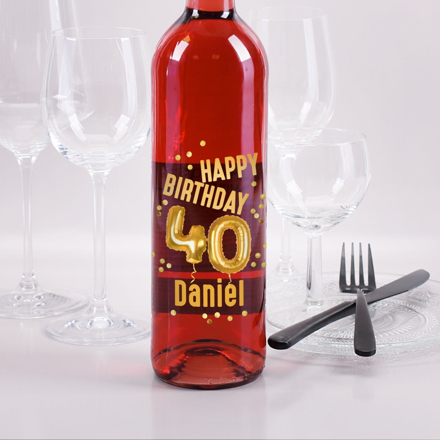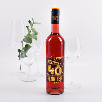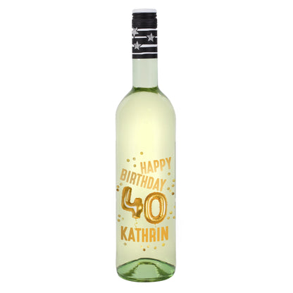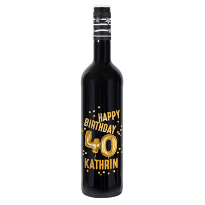 Personalisierte Weinflasche zum 40. Geburtstag – mit goldenem "Happy Birthday", Ballons & Name
