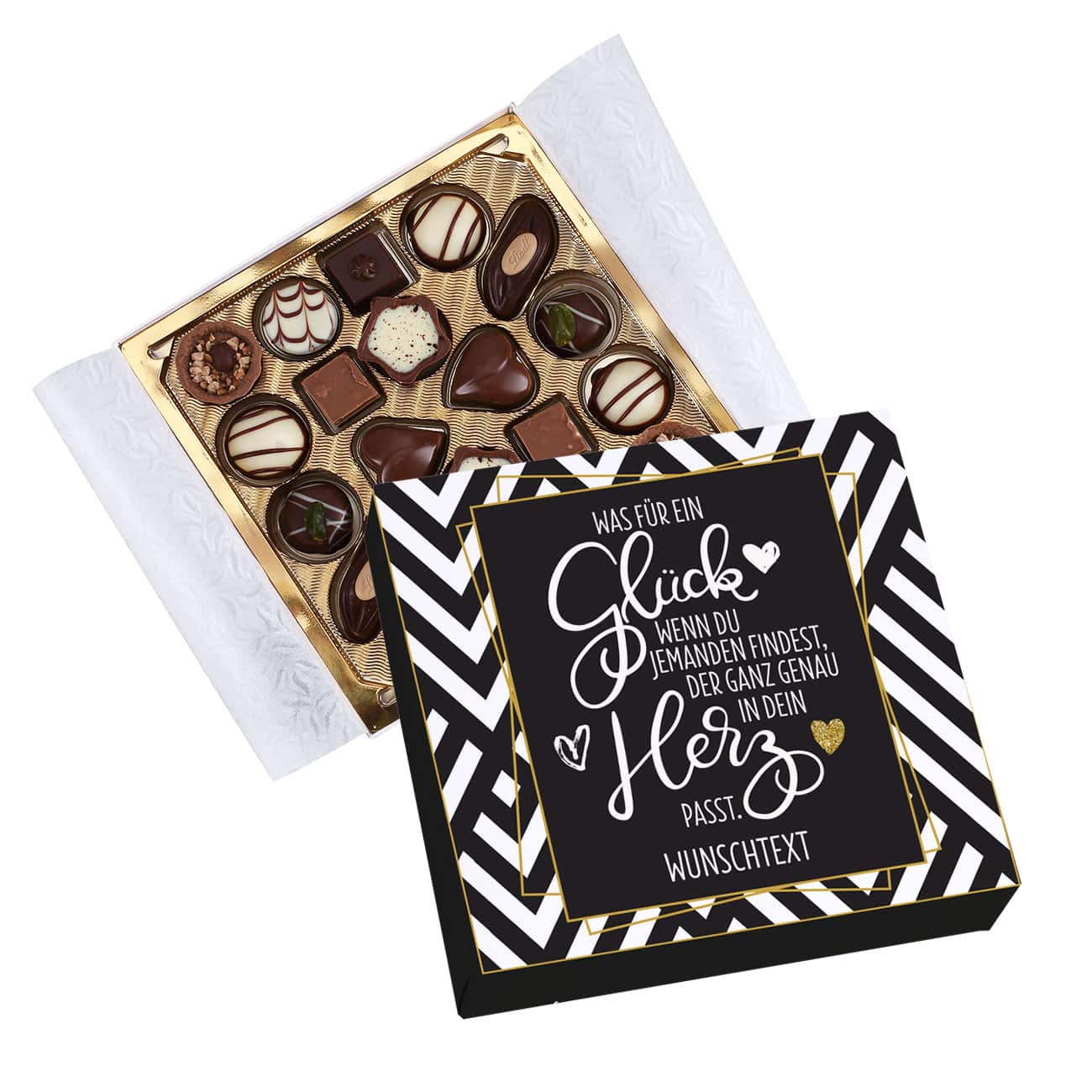 Die Pralinen der Marke Lindt werden von uns mit einer persönlichen Banderole versehen. Die Banderole ist auf der Vorderseite mit dem modernen schwarz-weissen Motiv bedruckt. Darauf zu sehen ist der Spruch "Was für ein Glück wenn du jemanden findest, der ganz genau in dein Herz passt.". Unter dem Spruch haben wird Platz gelassen für Ihre persönliche Botschaft an den Empfänger oder die Empfängerin. Hierbei können Sie Ihrer Kreativität freien Lauf lassen. Ob Ihre Namen oder ein paar liebe Worte, für Ihren Wunschtext haben Sie 50 Zeichen zur Verfügung. Achten Sie bei der Eingabe auf die korrekt Schreibweise, damit der Artikel so ankommt, wie Sie es sich wünschen.