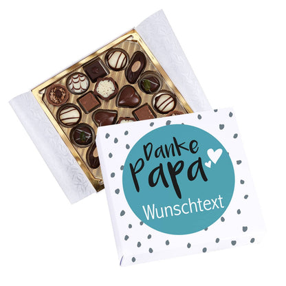 Die Pralinen werden mit einer bedruckten Verpackung verschenkt. Auf dieser steht groß "Danke Papa". Darunter ist Platz für Ihren persönlichen Text, auf dem Sie eine persönliche Botschaft und Ihre Gedanken verfassen können. Achten Sie hier auf die korrekte Schreibweise und verwenden sie keine Sonderzeichen und Emojis, damit der Artikel bei Ihnen so ankommt wie nach Ihren Wünschen.