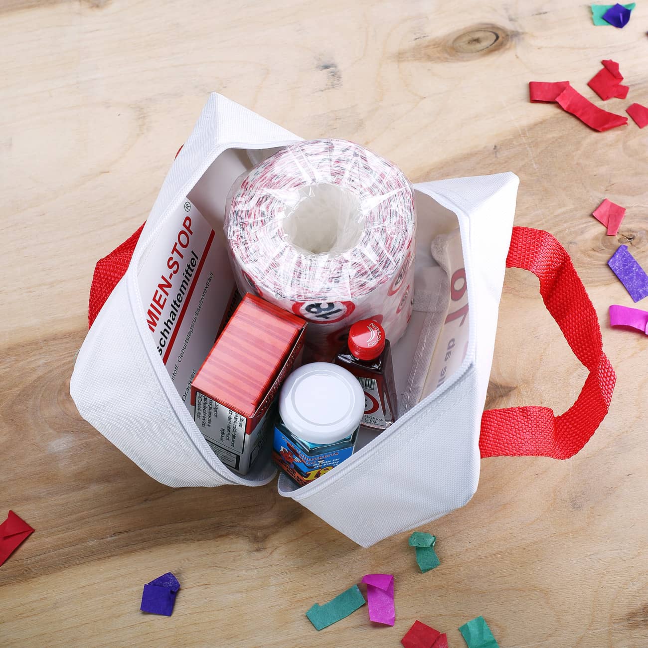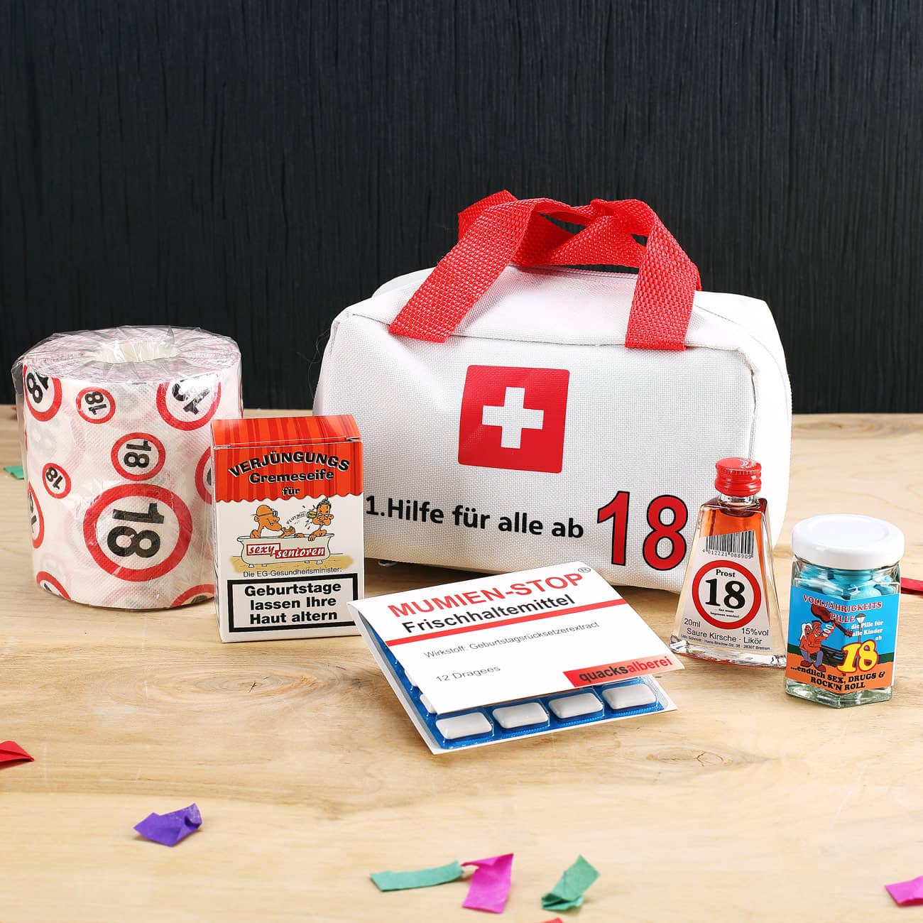 Diese 1. Hilfetasche ist das ideale Geschenk zum 18. Geburtstag. Erst kann man es kaum abwarten volljährig zu sein und schon merkt man die ersten Tücken des Alterns. Da kommt diese Hilfe natürlich genau zur richtigen Zeit. Wir haben ein schönes Set zusammengestellt, mit dem man schnell wieder jung und frisch wird.