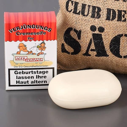 Im Set sind Traubenzuckerpillen, Body Cremeseife und Duschgel enthalten, die mit lustigen Etiketten auf die Verjüngungswirkung hinweisen. Eine witzige Idee für Geburtstagsgeschenke für einen Mann zum 50. Geburtstag.