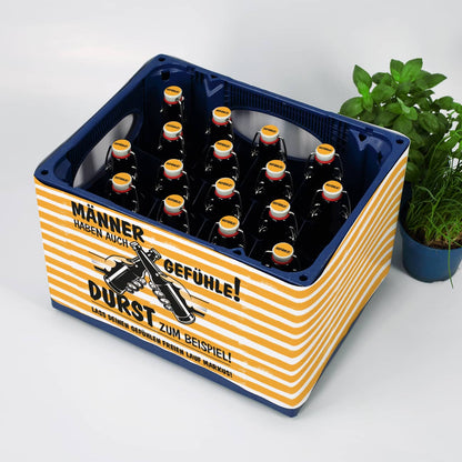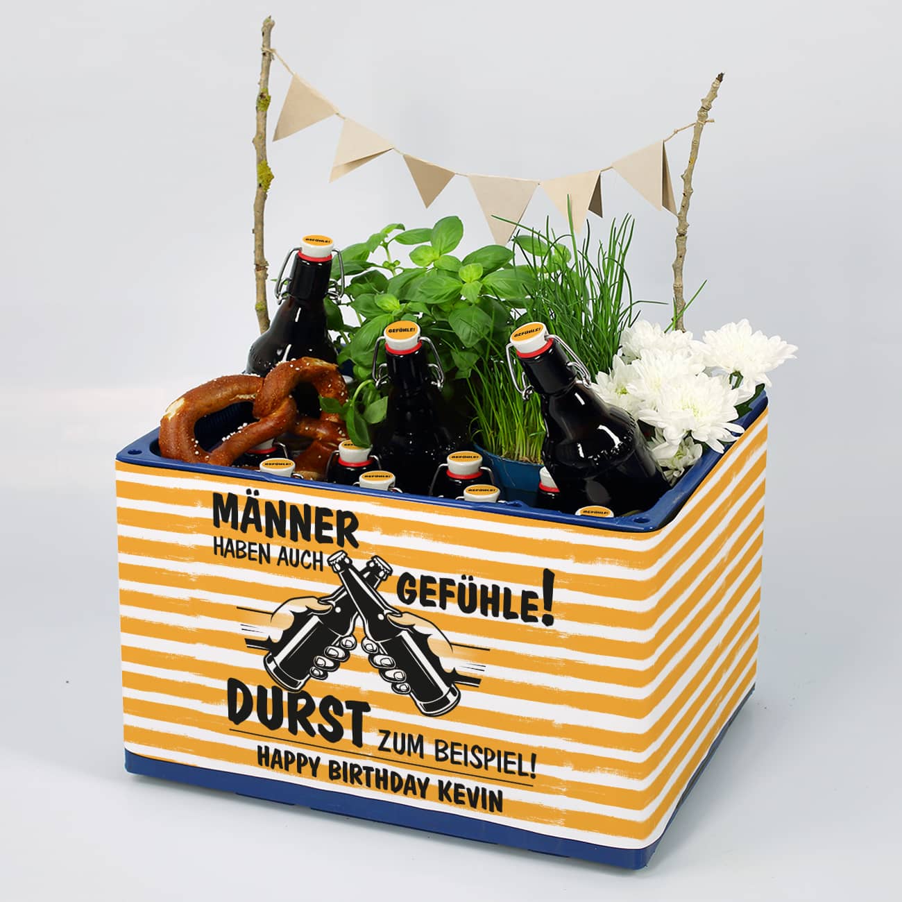 Mit der bedruckten Banderole machen Sie aus jedem Handelsüblichen Bierkasten ein cooles Geschenk zum Geburtstag, Vatertag oder zum Junggesellenabschied. Im Lieferumfang sind ebenfalls 24 Aufkleber für die Bierdeckel enthalten, was dieses DIY Geschenk Set für Bierkästen abrundet. Bedruckt wird die Banderole mit dem Schriftzug "Männer haben auch Gefühle - zum Beispiel Durst!", welcher mit einem Text nach Ihrem Wunsch ergänzt wird. Die kleinen Sticker für die Bierdeckel werden alle mit dem Wort "Gefühle" bedruckt. Passen Sie den Text je nach Anlass an und fertig ist das Geburtstagsgeschenk, Vatertagsgeschenk oder Geschenk zum Junggesellenabschied, das bei leidenschaftlichen Biertrinkern gut ankommen wird.