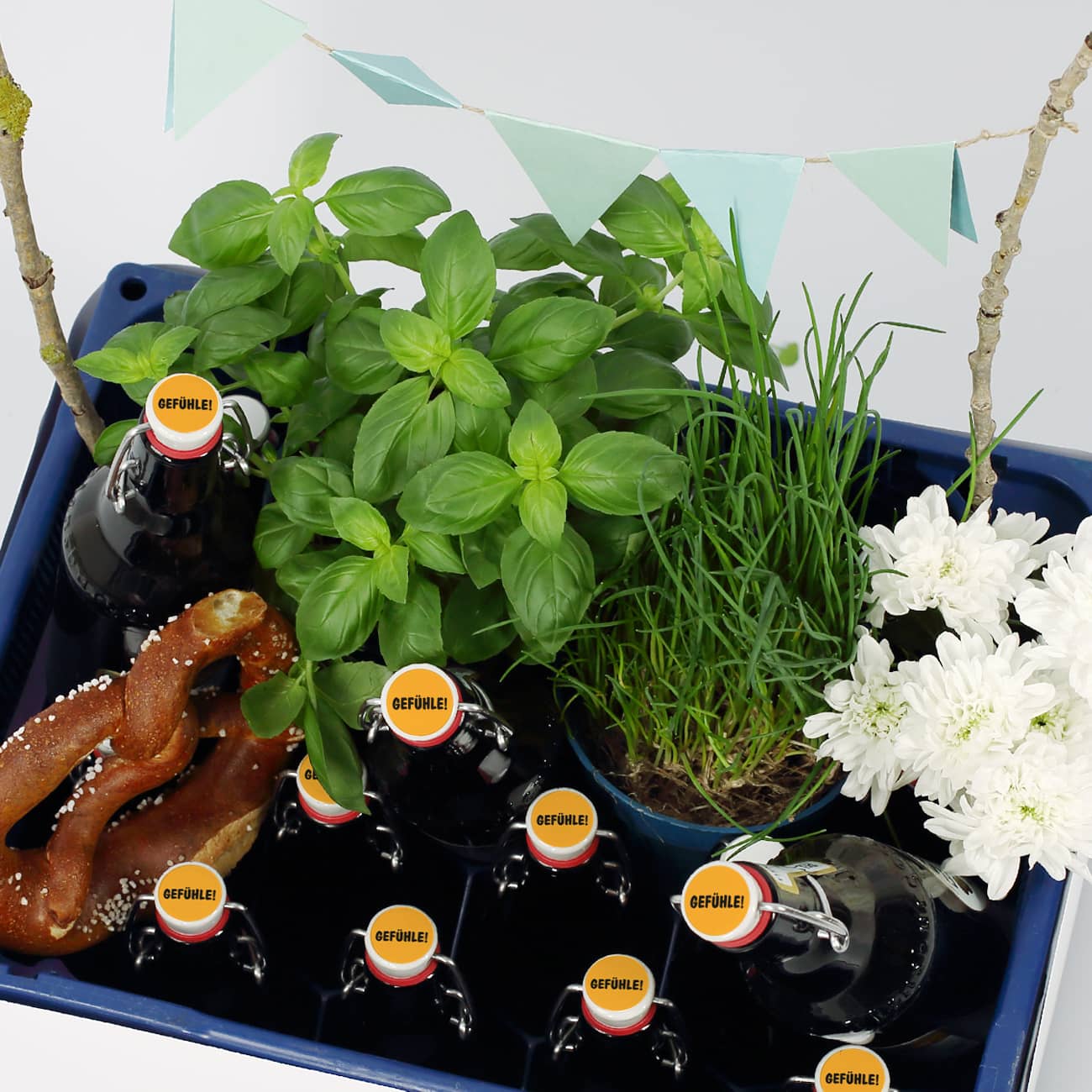 Mit ein paar eigenen Zusätzen können Sie aus diesem DIY Geschenk Set für den Bierkasten noch mehr herausholen. Nehmen Sie beispielsweise etwas Inspiration aus unserem Produktbild und dekorieren Sie den Bierkasten mit Kräutern, Snacks, Blumen oder Fähnchen. So wird der Biergenuss mit Freunden noch besser. Natürlich können Sie noch andere Geschenke dazu legen und mit diesem Set für den Bierkasten ein Geldgeschenk kreieren oder Gutscheine hinzu legen. Fertig ist der einmalige Bierkasten für Männer mit Gefühlen!