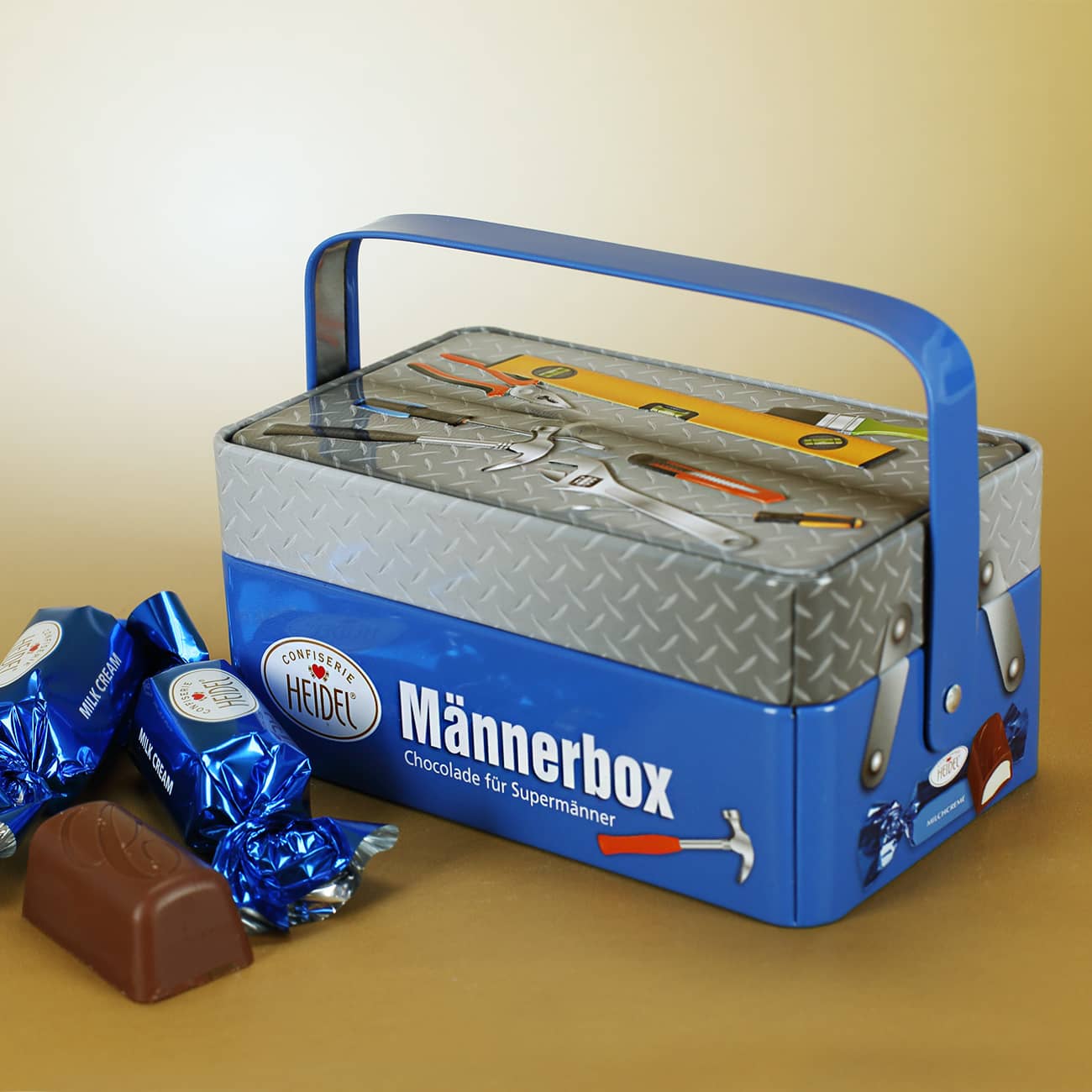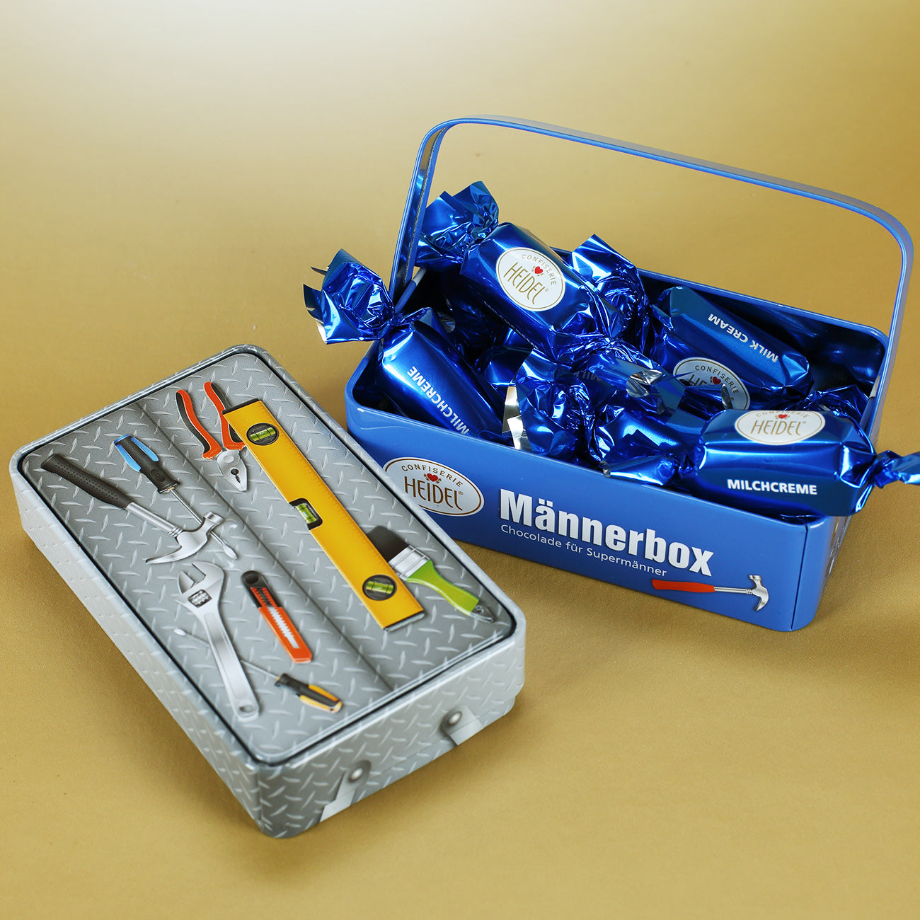 Coole Männerbox aus Blech gefüllt mit Schokolade