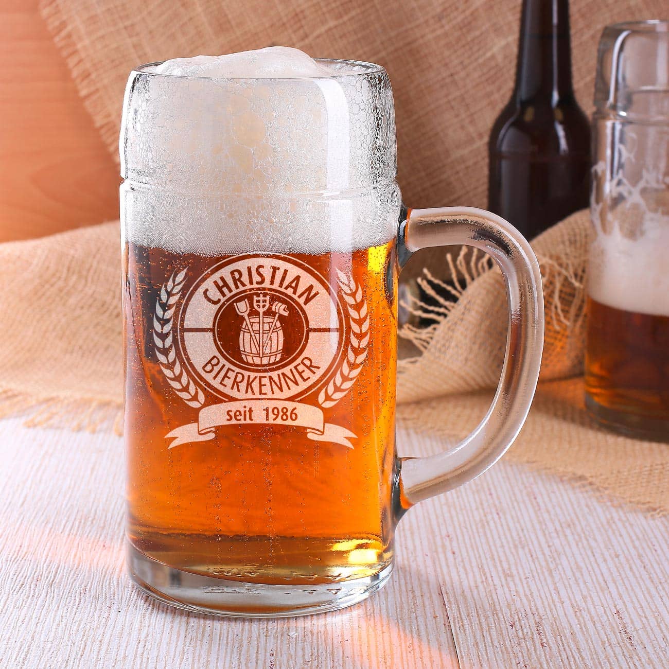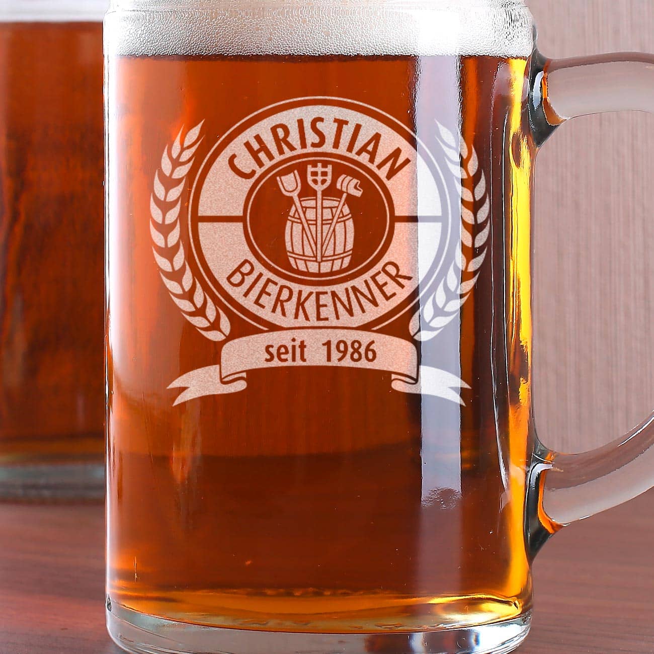 Der geeichte Maßkrug mit Gravur verfügt über ein Volumen von 1 Liter bis zum Füllstrich und ist für Bierkenner genau das richtige Geschenk zum Geburtstag, Vatertag oder zu jedem anderen Anlass. Der Glaskrug wird mit dem Motiv eines Bierfasses und den zu früheren Zeiten benutzten Bierbrau-Utensilien gestaltet. Um dieses Design befindet sich ein Ring, in welchem der Name nach Wunsch sowie das Wort "Bierkenner" graviert wird. Zu beiden Seiten dieses Kreises befinden sich Ähren. Unter dem Motiv ist eine Banderole gestaltet, welches das Wort "seit" enthält, dass mit dem Jahr der Geburt vervollständigt wird. So ein Humpen aus dickem Glas liegt am allerbesten in der Hand und hält das Bier lange kühl.