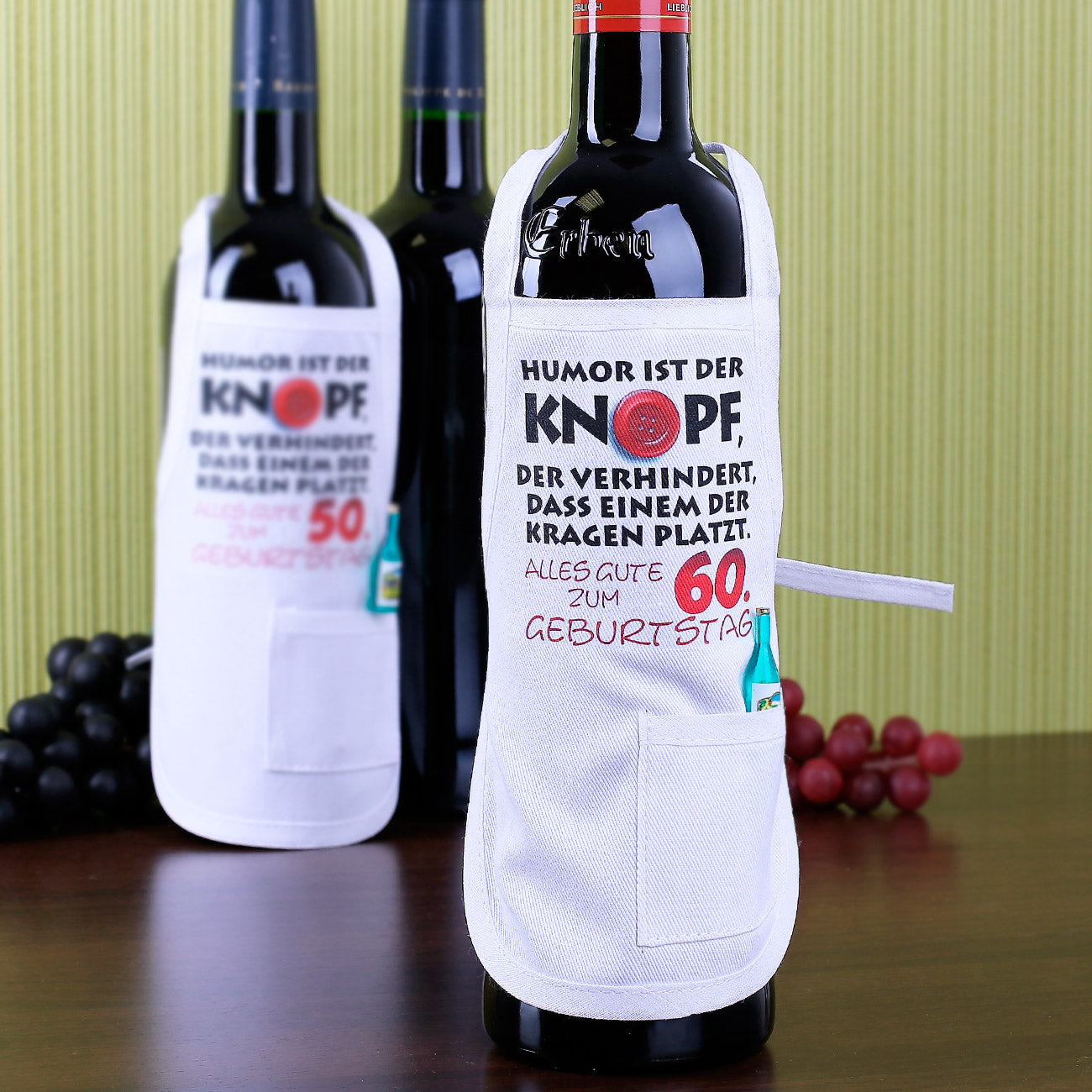 Die hochwertig verarbeitete Schürze im Miniaturformat ist mit dem Aufdruck "Humor ist der Knopf, der verhindert, dass einem der Kragen platzt." versehen und wird aus Ihrer Flasche ohne Frage einen Hingucker machen.