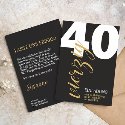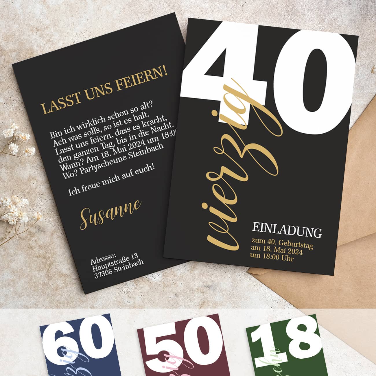Gestalten Sie Ihre Einladungskarten zum Geburtstag ganz nach Ihren persönlichen Vorstellungen mit unserer bedruckten Einladungskarte, die in vier ansprechenden und modernen Farbvarianten erhältlich ist. Die Personalisierung ermöglicht es Ihnen, das Alter sowohl als Zahl als auch ausgeschrieben auf der Vorderseite abzubilden. Darüber hinaus bietet die Karte ausreichend Platz für mehrere Zeilen Text, die individuell für Grußformeln, die Adresse, den Einladungstext und weitere Angaben genutzt werden können. So schaffen Sie eine einzigartige und persönliche Einladung zum Geburtstag, die genau Ihren Vorstellungen entspricht.
