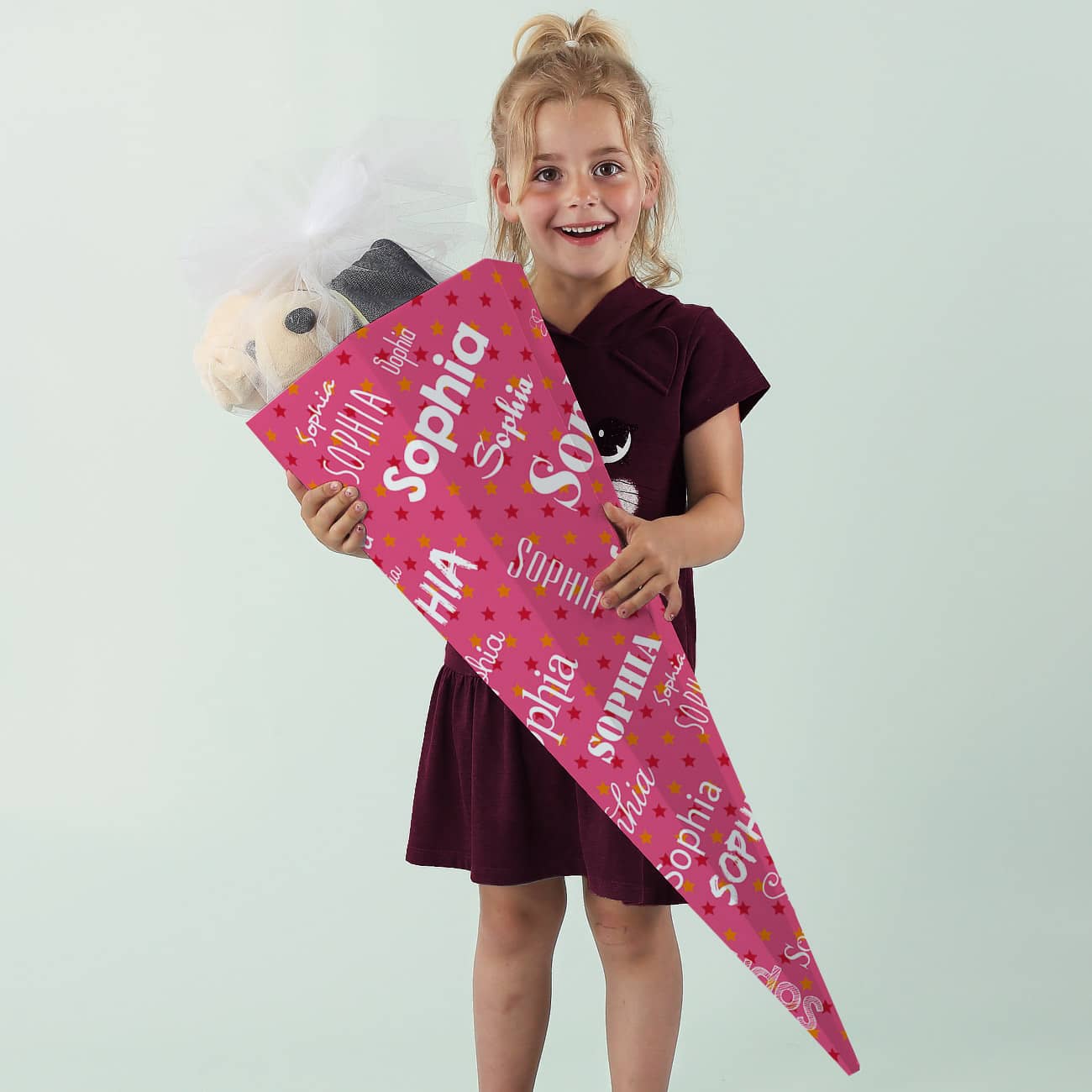 Diese 80 cm hohe Exemplar mit weißem Tüllverschluss fällt garantiert aus dem Rahmen des bunten Schultüten-Angebots. Sie besitzt einen vergleichsweise dezenten Hintergrund in Rosa mit kleinen Sternen in Orange und Rot. Das Besondere an diesen sechseckigen Schultüten ist jedoch der umlaufende Namensaufdruck in ganz verschiedenen Schriftarten. Mit dieser außergewöhnlichen Zuckertüte präsentiert sich Ihre Schulanfängerin sich sehr stolz in der Schule und auf den Familienfotos.