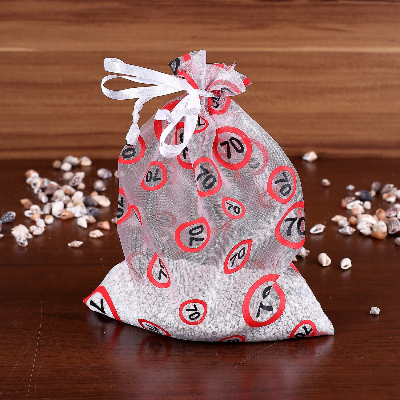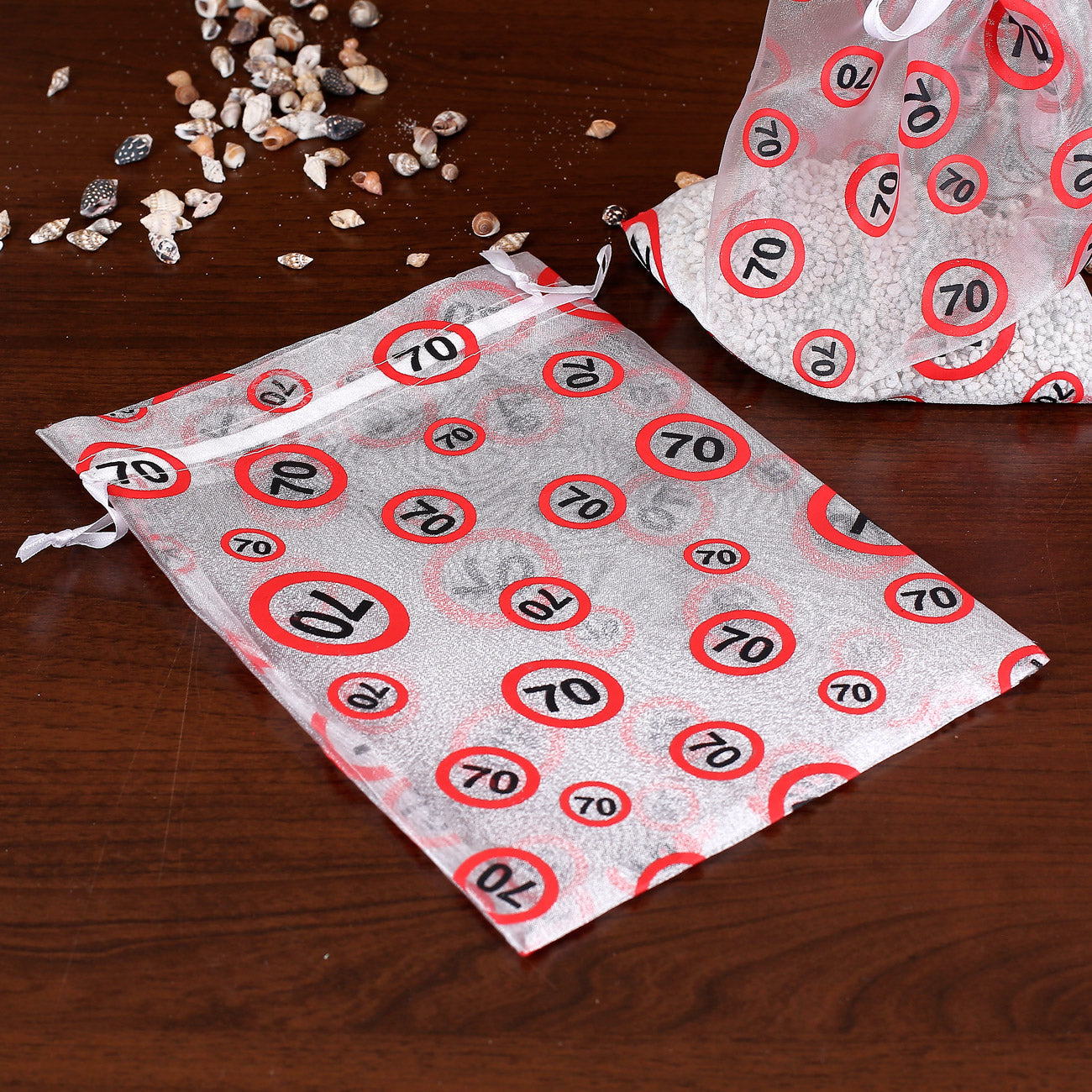 Der 70. Geburtstag Ihres Opa´s, Vater´s oder eines Freundes steht bevor und Sie suchen noch eine kleine Verpackungsidee? Wie wäre es dann mit einem schönen Organzabeutel? Dieser ist transparent und bietet genügend Platz für ein kleines Mitbringsel oder ein kleines Geschenk. Der Beutel aus Organza ist mit mehreren Kreisen in verschiedenen Größen verziert. In den jeweiligen Kreisen, die in einer Verkehrsschildoptik gestaltet sind, steht die Zahl 70 drin, somit weiß jeder das der Beschenkte 70 Jahre wird. Die Öffnung kann mit einem passenden weißen Band zusammen gezogen werden, damit der Inhalt sicher verpackt ist.