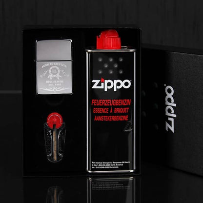 Es handelt sich hier um ein Original Zippo Geschenkset, bestehend aus dem Feuerzeug, Original Zippo Benzin und Feuersteinen. Zu dem Feuerzeug gibt es eine praktische Zippo-Plastikhülle, die Sie zum Schutz und zur Präsentation des Feuerzeuges nutzen können. Das Feuerzeug hat eine verchromte, glatte Oberfläche.