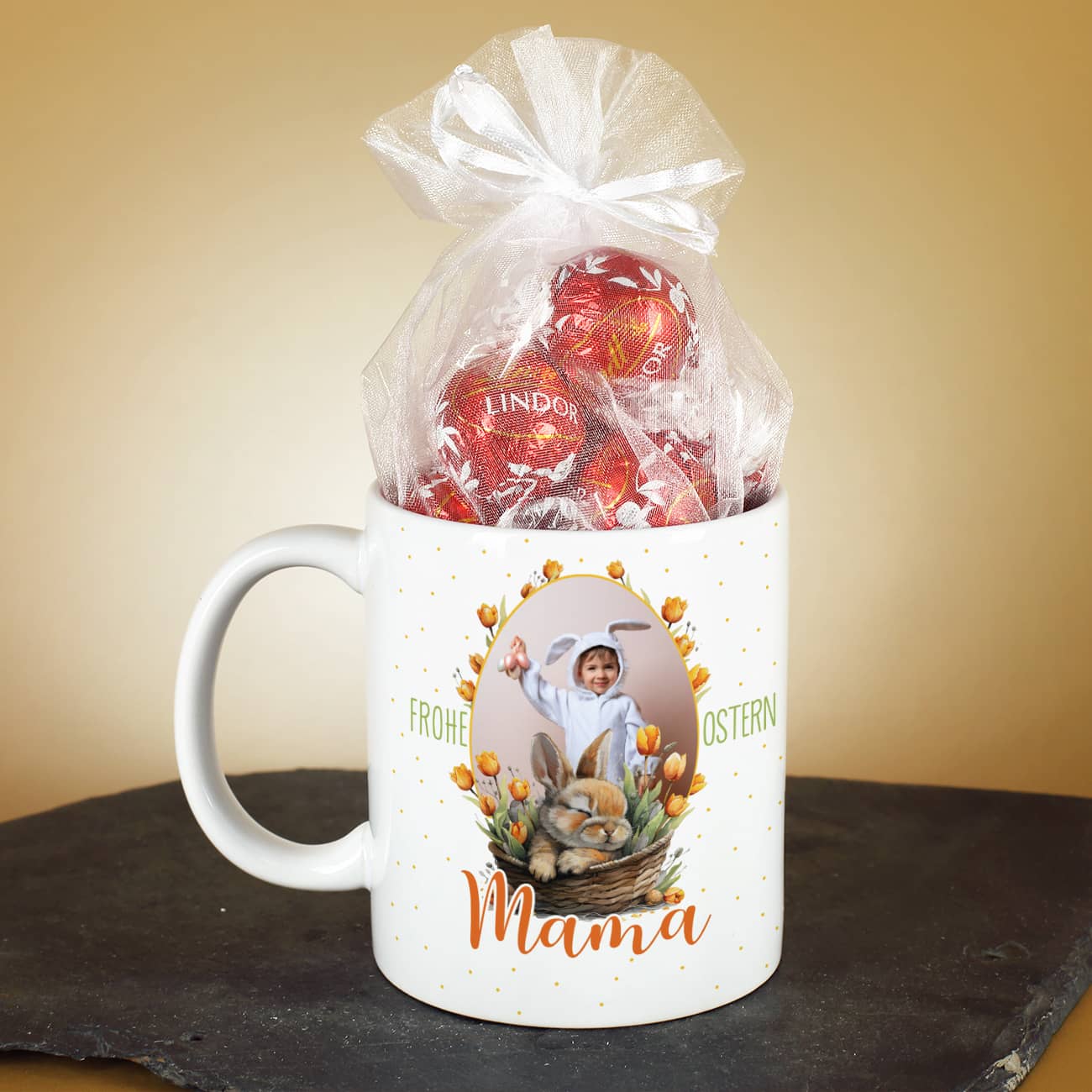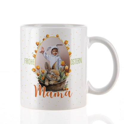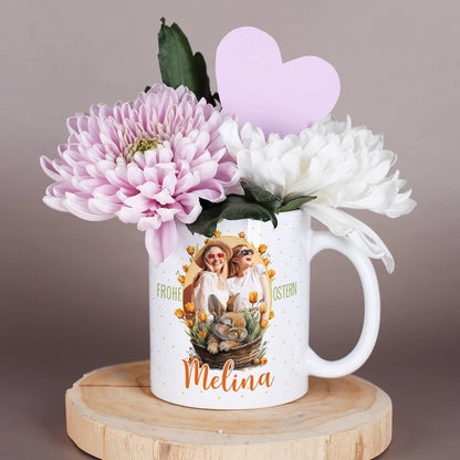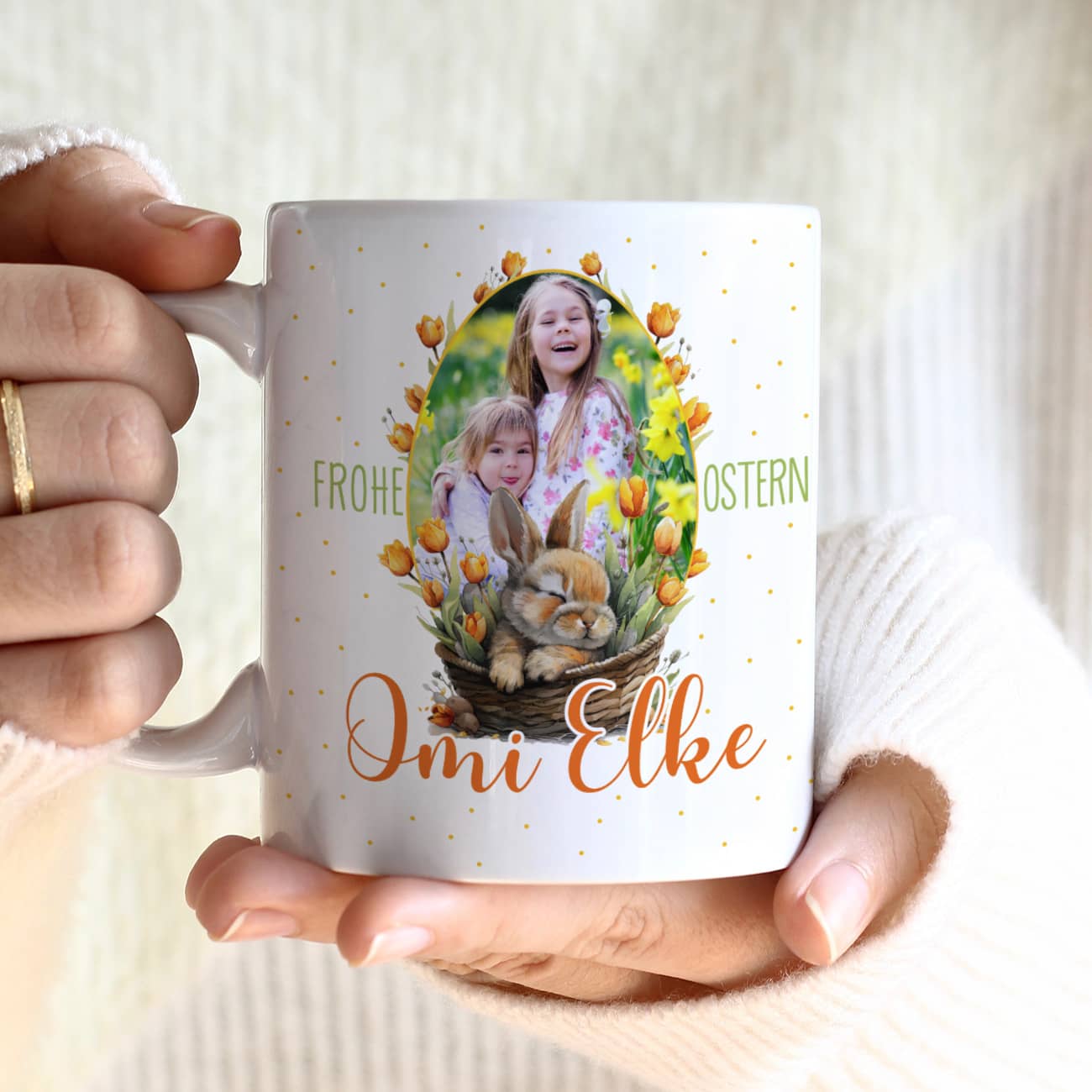 Überraschen Sie Ihre Liebsten zu Ostern mit unserer personalisierten Fototasse, die mit einem niedlichen Ostermotiv verziert ist. Auf dem Motiv ist ein Osterkörbchen mit einem schlafenden Hasen zu sehen, in das Ihr Foto nach Wunsch integriert wird. Ergänzt wird das Motiv mit einem Namen Ihrer Wahl, was diese Tasse zu einem einzigartigen und persönlichen Ostergeschenk für Frauen, Männer und Kinder macht. Denn wer freut sich nicht über ein Bild seiner Liebsten auf einer Tasse? Verschenken Sie Freude zu Ostern mit unserer personalisierten Fototasse und machen Sie Ihren Liebsten eine ganz besondere Überraschung. Bestellen Sie jetzt und profitieren Sie von unserer schnellen Lieferung in wenigen Werktagen!