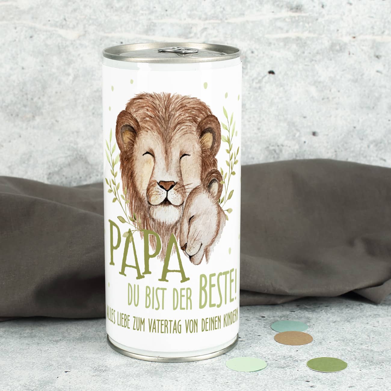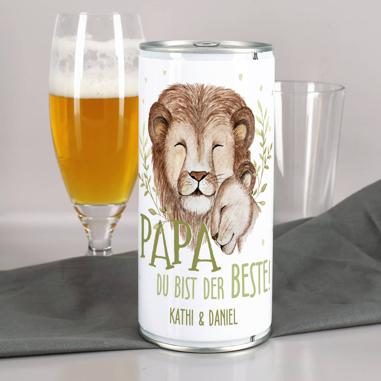 Überraschen Sie Ihren Papa mit dieser Bierdose mit persönlichem Etikett, das perfekt zum Geburtstag oder Vatertag passt. Zeigen Sie Ihre Wertschätzung mit dem handgezeichneten Löwen Motiv, welches einen Papa mit seinem Kind darstellen soll. Darüber drucken wir den Spruch "Papa, du bist der Beste!", welcher mit einem Text nach Ihrem Wunsch ergänzt wird. Hier können Sie ein paar liebe Worte, Glückwünsche zum Anlass oder auch Ihren Namen und die Ihrer Geschwister hinterlassen. Fertig ist ein erfrischendes, aber auch sehr persönliches Vatertagsgeschenk, Geburtstagsgeschenk oder Dankeschön Geschenk zwischendurch! Genießer werden sich über Biergeschenke wie dieses riesig freuen können.