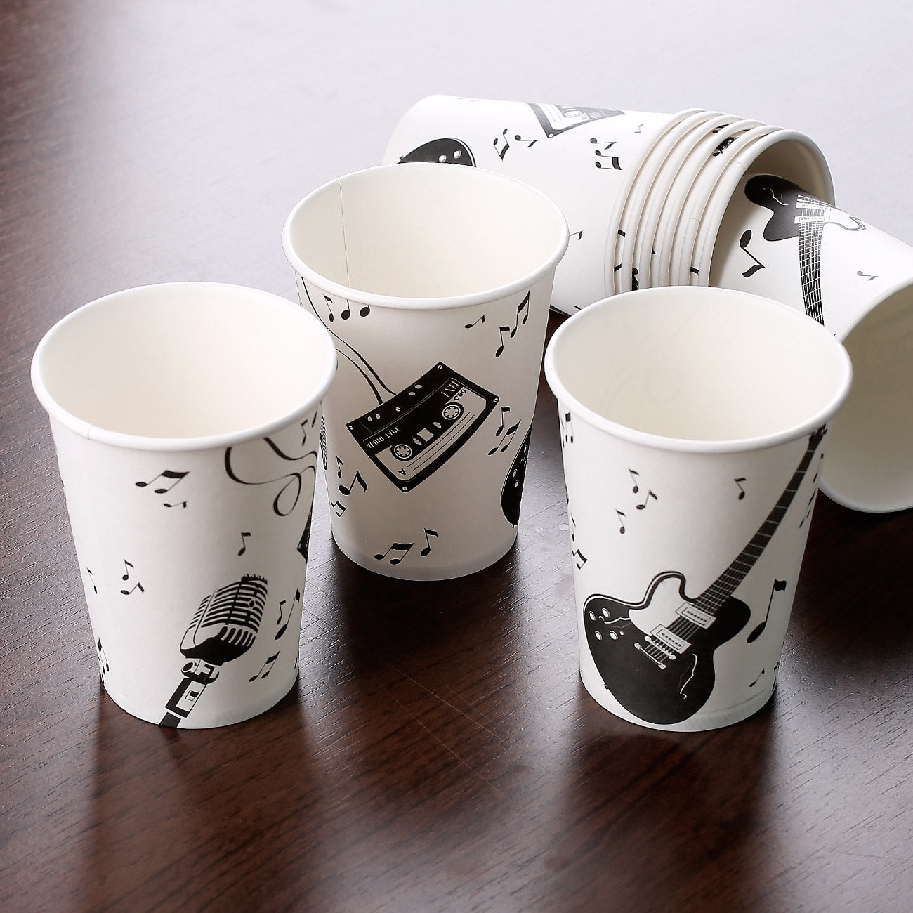 Bei Ihnen steht eine Motto-Party rundum Musik und Noten an? Dann haben wir hier für sie das perfekte Party-Accessoire! Die 10 originellen Pappbecher sind mit schwebenden Noten, einer Gitarre, einem Mikrofon und einer Kassette bedruckt. Die Becher aus Pappe haben ein Fassungsvolumen von 266 ml und eine Größe von 7,5 cm 9,5 cm (Ø/H).