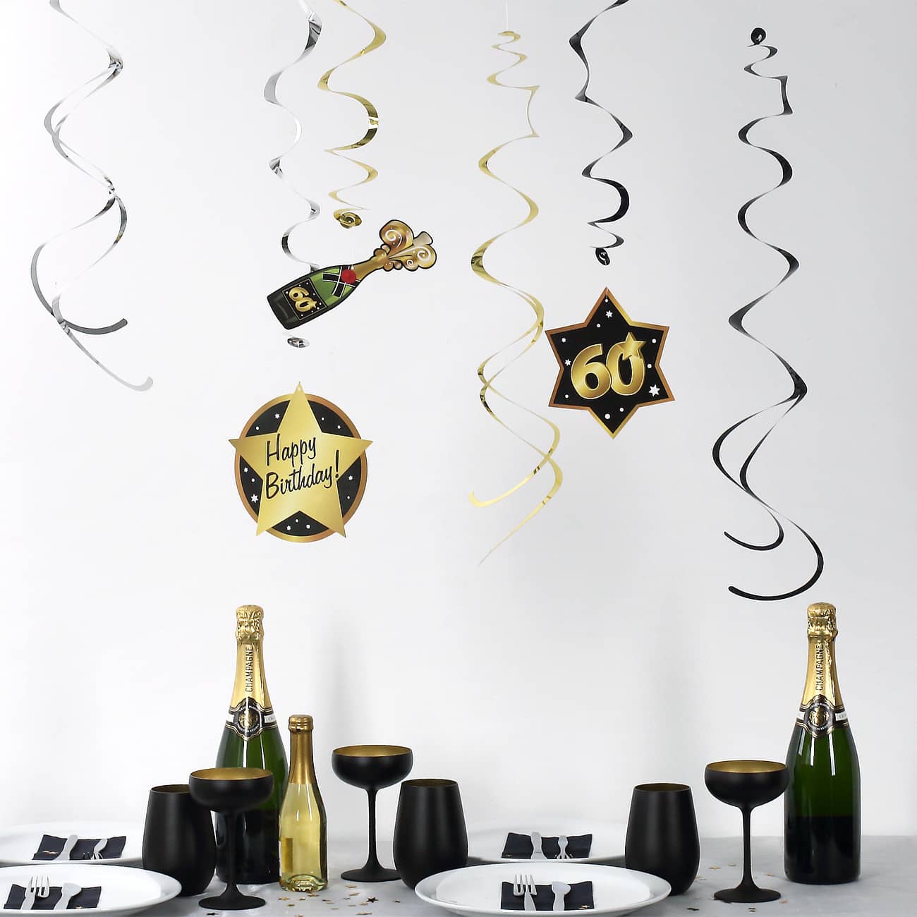 An den silbernen, goldenen und schwarzen Spiralen in diesem Set winden sich verschiedene Motive, die meist mit einer 60 versehen sind und zu denen Sektflaschen, Sterne und ein „Happy Birthday“-Schild gehören.
