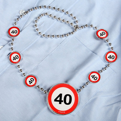 Die Partykette zum 40. Geburtstag ist ein fetziges Accessoire für spritzige Feten. Sie besteht aus mehreren Verkehrszeichen mit einer 40 darin. In der Mitte hängt ein großes Verkehrszeichen und bis zum Hals verteilt befinden sich kleinere Verkehrsschilder. Super für das Geburtstagskind, diese Kette wird garantiert für einige Lacher sorgen. Überraschen Sie das Geburtstagskind mit dieser witzigen Kette. Viel Spaß beim Verschenken!
