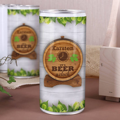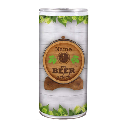 Das Motiv der Bierdose besteht neben Hopfen aus einem Bierfass. Darauf wird Ihr gewünschten Name abgebildet, gefolgt von dem Schriftzug - It's beer o'clock -.