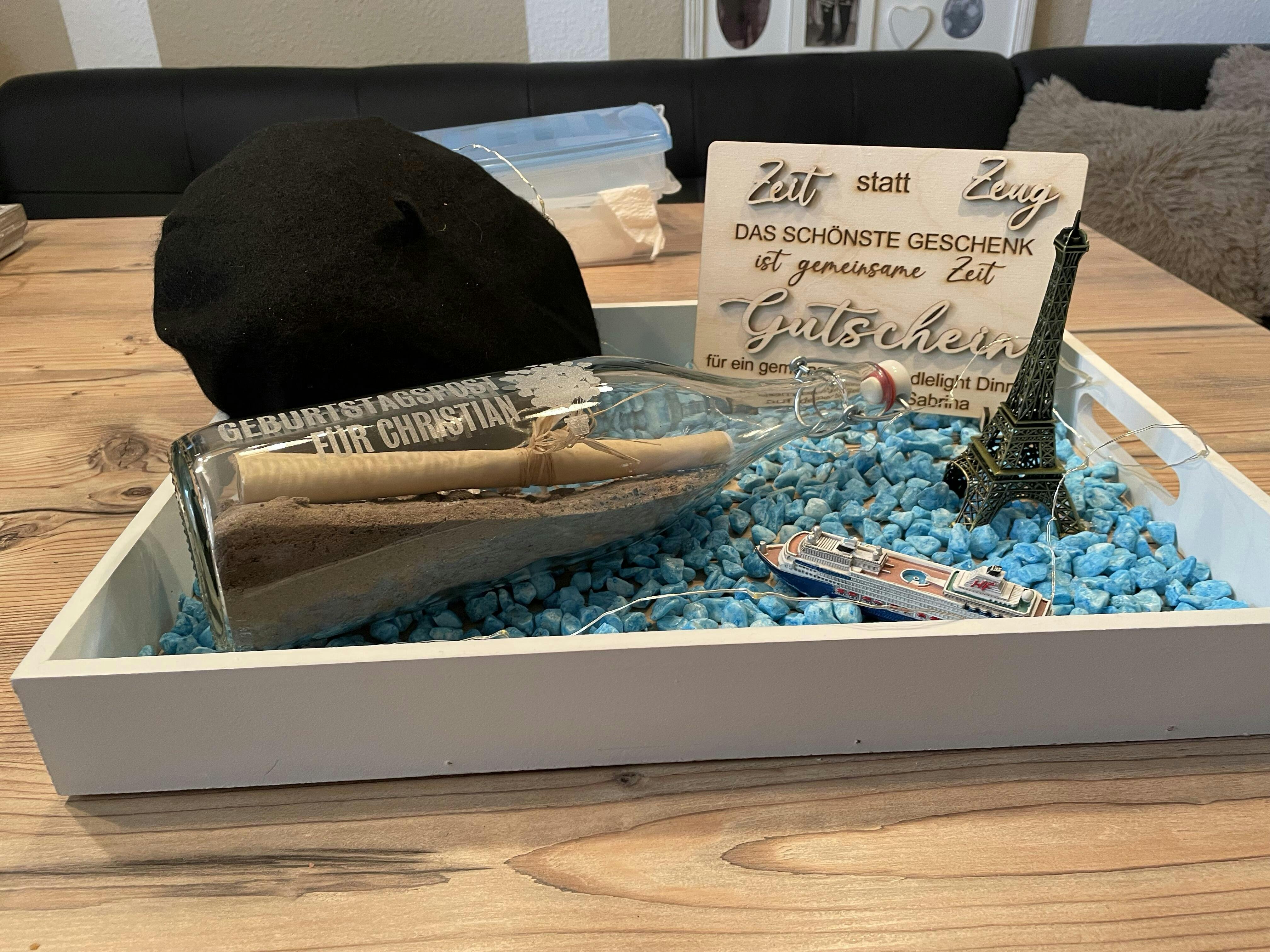 Das besondere an der Flaschenpost ist nicht nur die individuelle Gravur, die Bügelflasche können Sie mit Sand und Muscheln befüllen,der von uns mitgeliefert wird, um dem ganzen Geschenk einen maritimes Design zu verpassen. Somit eignet sich die Geburtstagspost auch wunderbar als Dekoration für Zuhause.