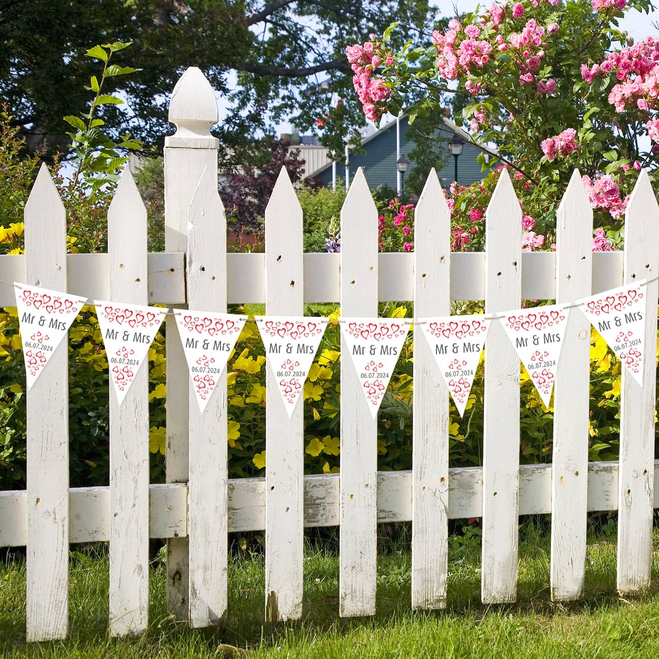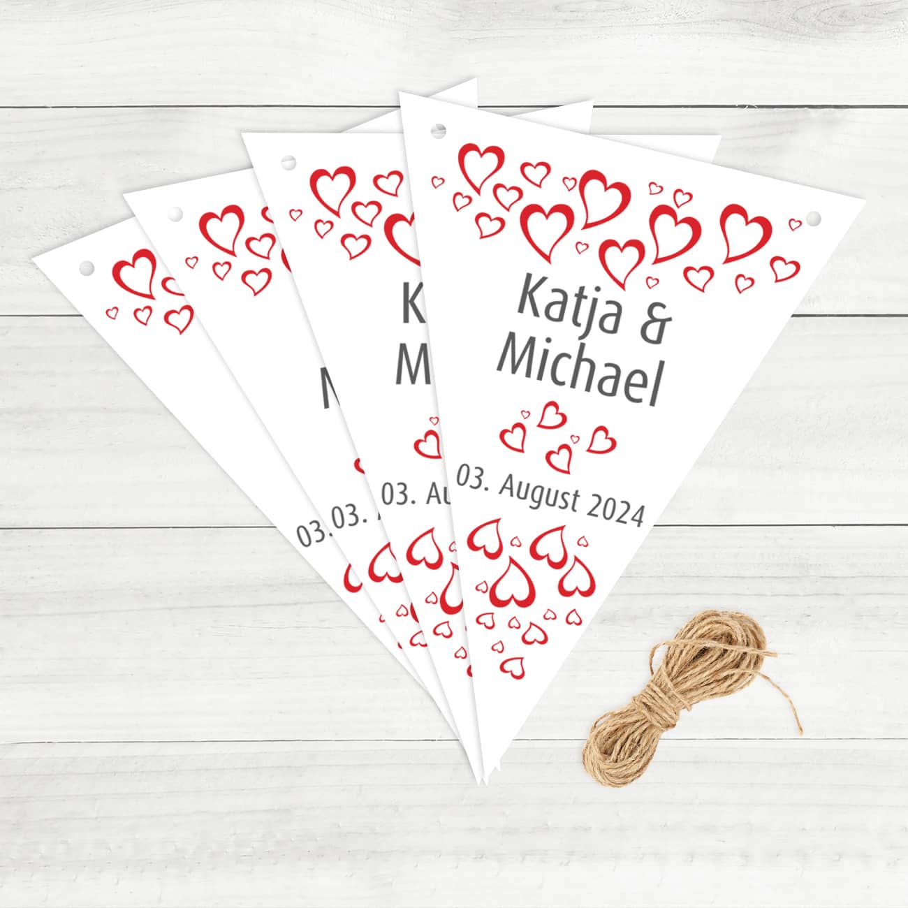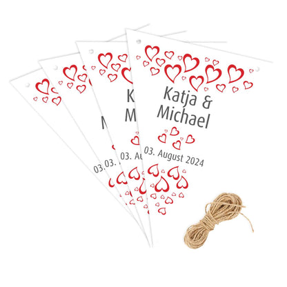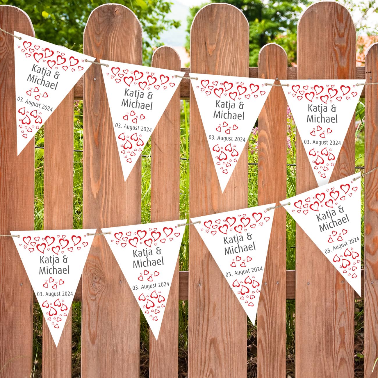 Feiern Sie Ihren Polterabend oder Ihre Hochzeit mit einer individuellen Note und setzen Sie mit unserer maßgeschneiderten Wimpelkette einzigartige Akzente! Diese persönlich bedruckte Girlande ist mit Ihren Namen und dem Datum Ihrer Wahl verziert, umrandet von verspielten roten Herzchen, die eine romantische Atmosphäre schaffen. Unsere Wimpelkette besteht aus insgesamt 20 Wimpeln, die beidseitig bedruckt sind und somit aus jedem Blickwinkel für bewundernde Blicke sorgen. Die Girlande wird inklusive einer 10 m langen Schnur geliefert, sodass Sie sie ganz einfach und flexibel aufhängen können.