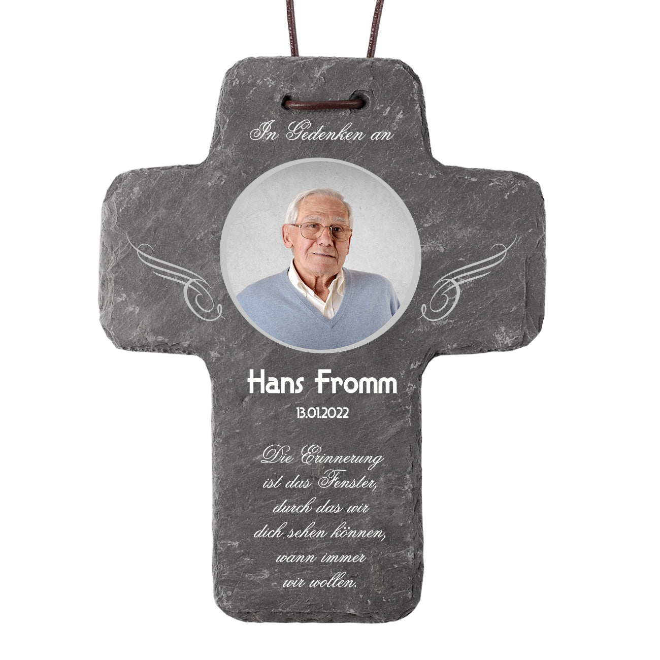 Die Erinnerung ist das Fenster, durch das wir dich sehen können, wann immer wir wollen. Mit diesem Spruch bedrucken wir das persönliche Gedenkkreuz für Ihren lieben Verstorbenen. Hinzu kommt ein Foto Ihrer Wahl, der entsprechende Name sowie die Jahreszahlen oder die kompletten Daten mit Tag und Monat.