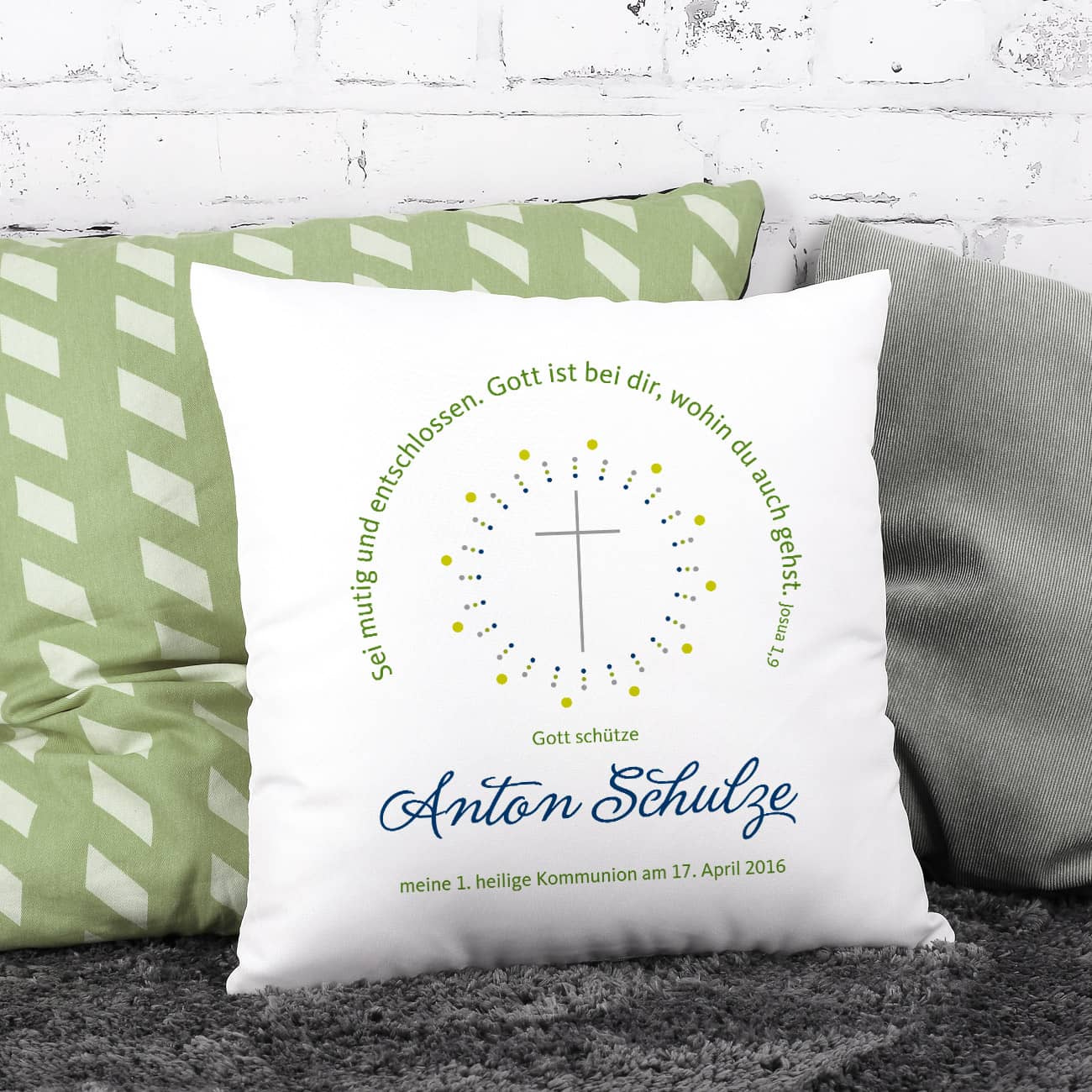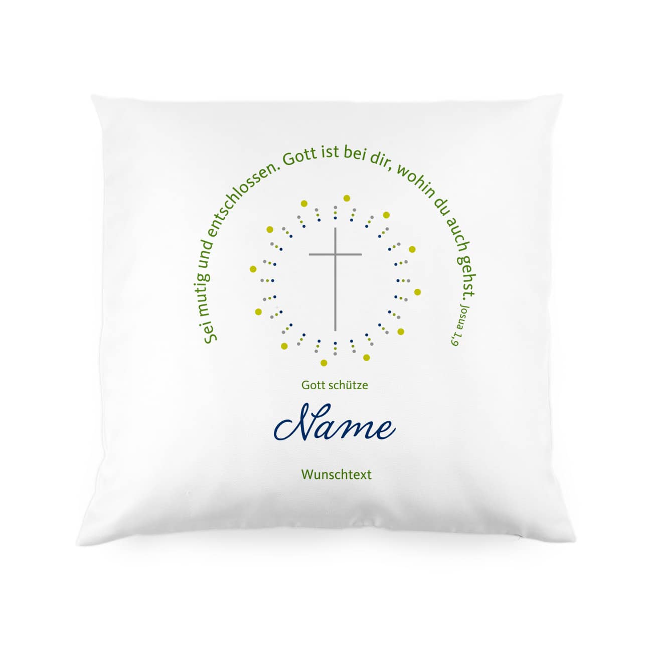 Dieser Vers ziert das religiöse Kissen für Jungen. Es ist eine sehr persönliche Geschenkidee zur Konfirmation, Kommunion, oder Taufe. Unter die Zeile "Gott schütze" drucken wir Ihren gewünschten Namen, sowie einen individuellen Glückwunschtext oder den Anlass der Schenkung. Hinzu kommt ein dezentes Motiv aus einem zarten Kreuz im gepunkteten Kreis.