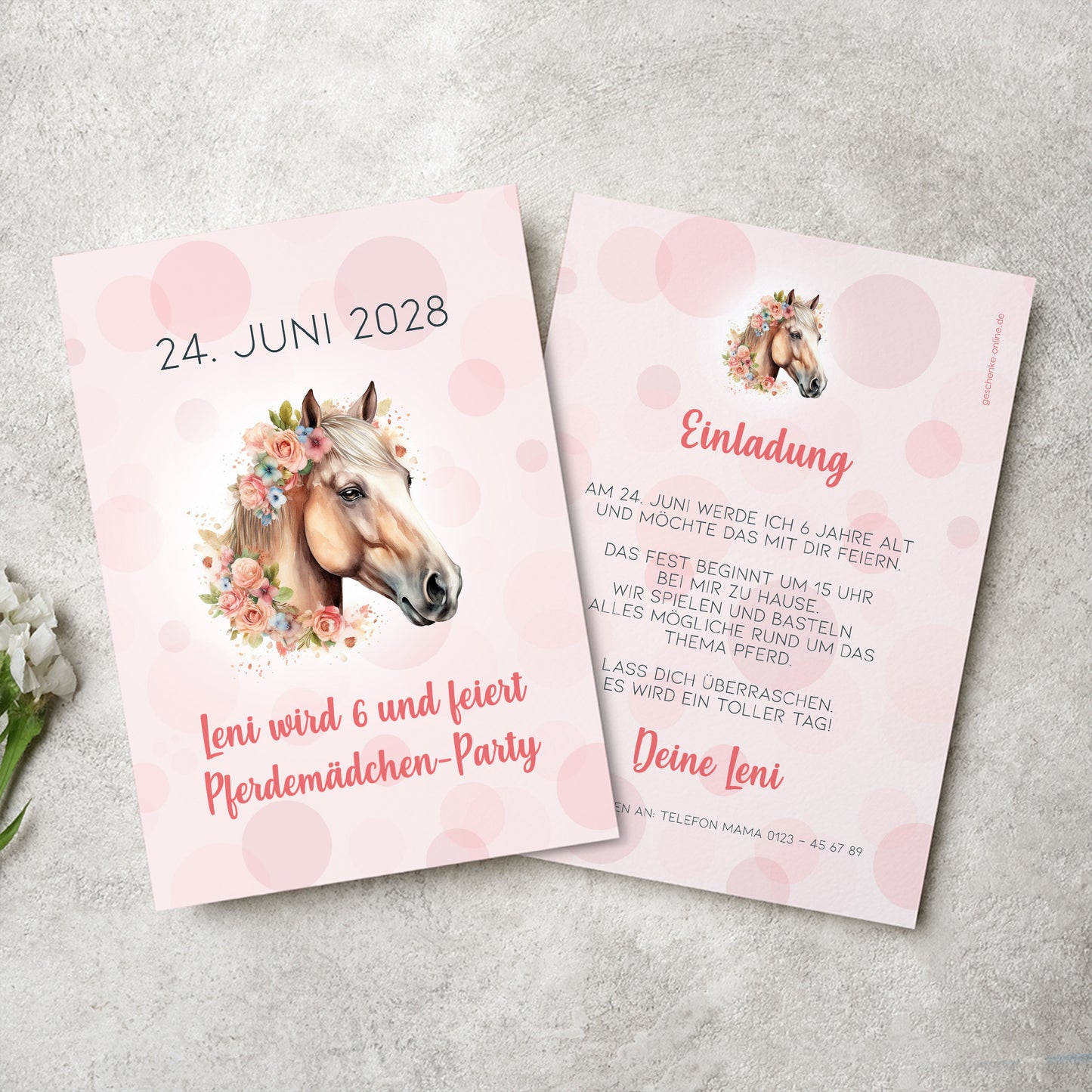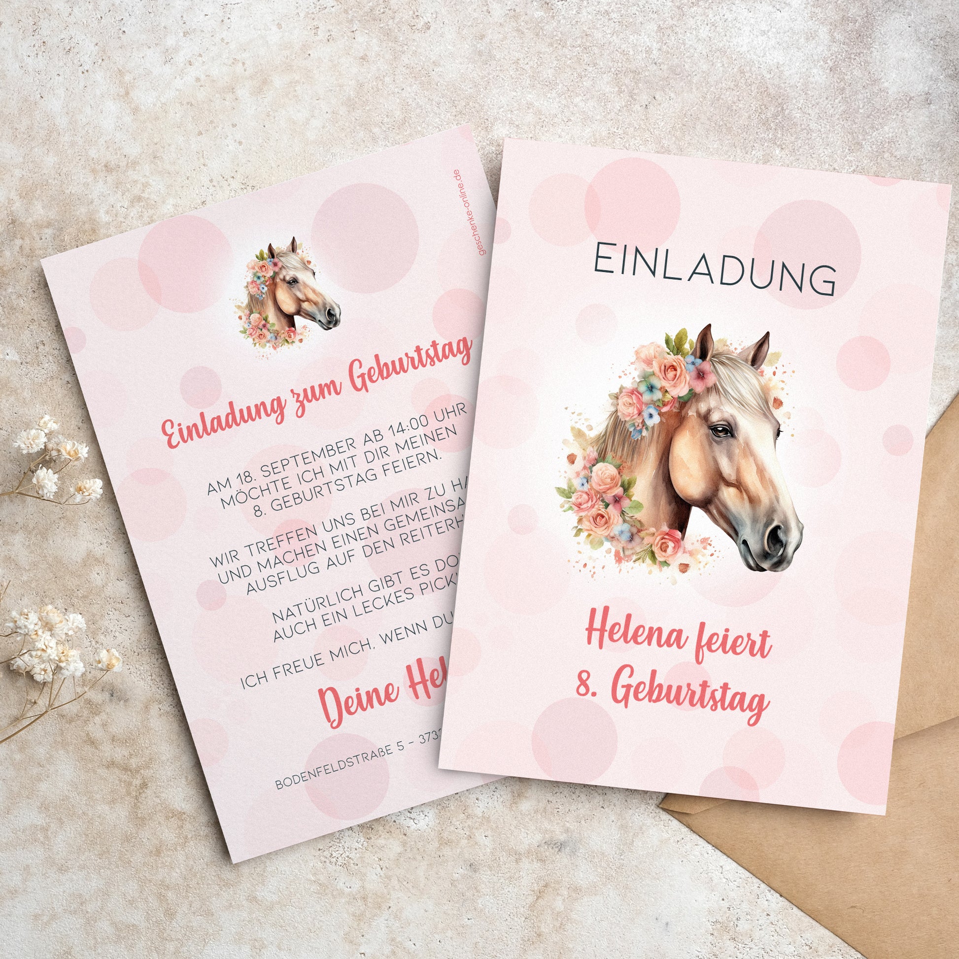 Personalisierte Einladungskarte Kindergeburtstag – Pferdemotiv mit Blumen 🐴🌸🎉